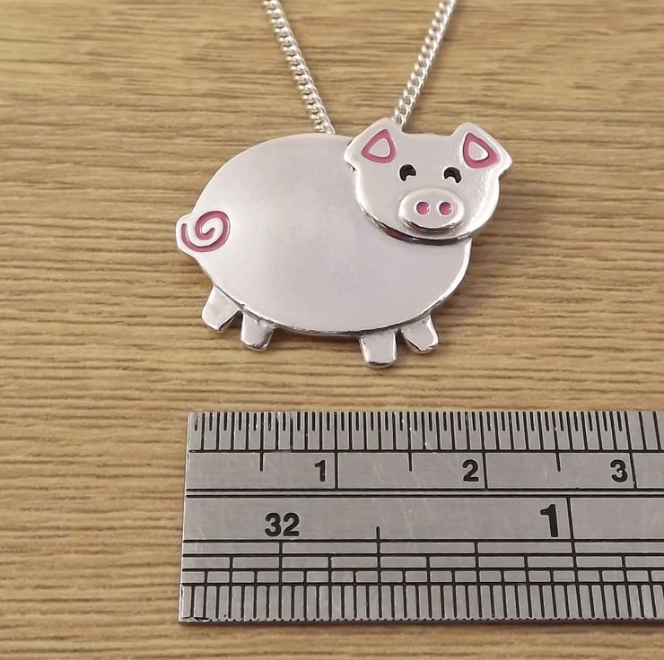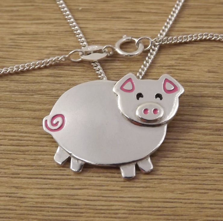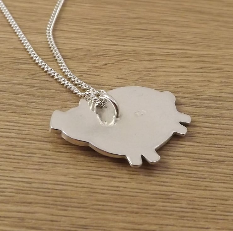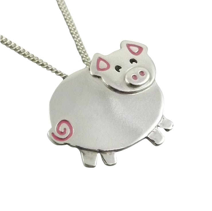 This pig pendant has been lovingly handcrafted in Britain. It is made from sterling silver sheet and is etched before being cut by hand. The edges are then smoothed using files and emery paper before the snout, head and body are soldered together. It's then given it's shape using a punch and hammer and a short length of wire at attached to hold the chain. Pink and black enamel resins are used to give the pendant colour, and then the piece is then polished before being attached to a chain.