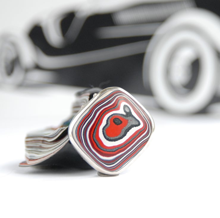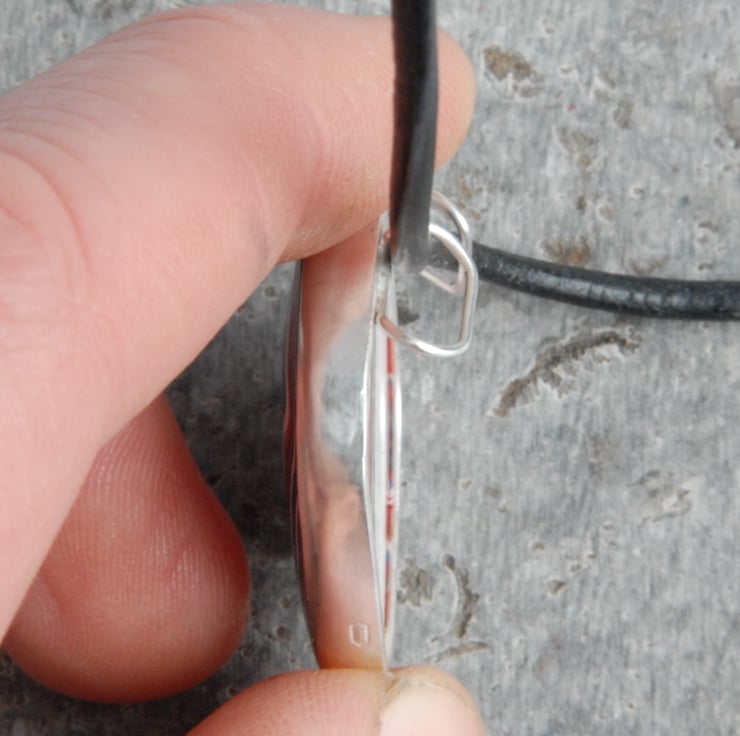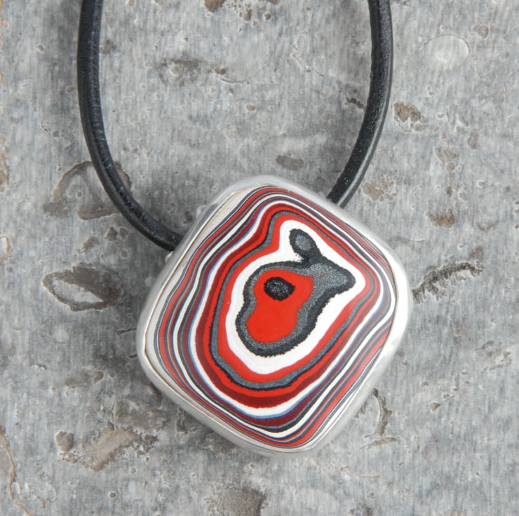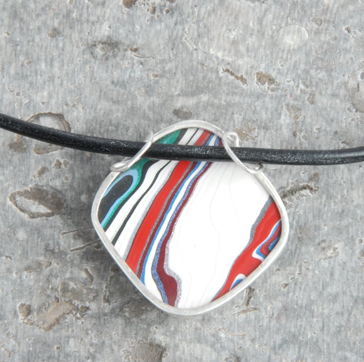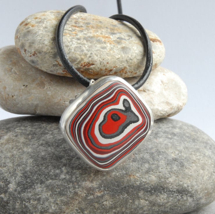 This bright pendant features a diamond of Harley fordite which has been bezel set in sterling silver. The fordite has a pattern of rings in shades of red (some are sparkly), white and grey making it suitable for a gent, a lady or anyone who loves the unusual (or their motor bike). Measures 30mm top to bottom and 29mm across, it has an integral bail behind the fordite which is large enough to fit a leather thong (as shown in the photos) or silver chain but you could also put it on ribbon if you wanted to. I can supply it with either a chain or leather thong, please use the variations to choose.