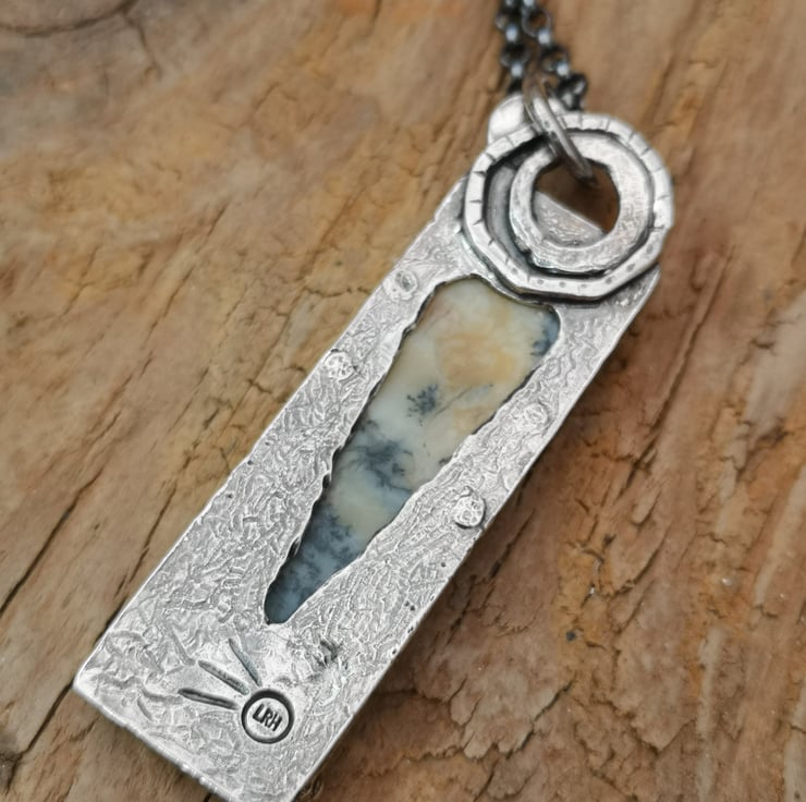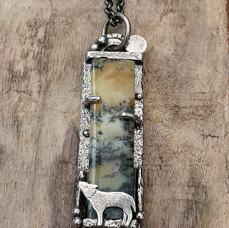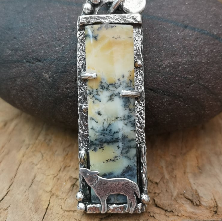 Made using traditional jewellery making techniques, including hammer texturing and hand engraving, this little wolf guards a beautiful dendritic opal stone.