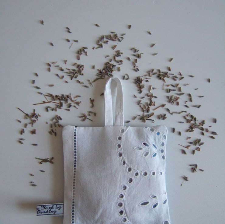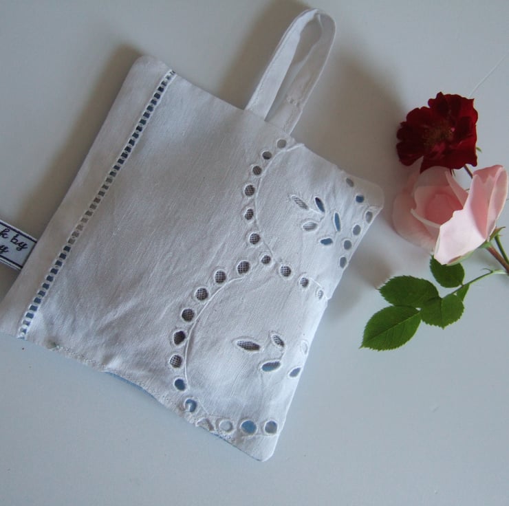 The back is made from a section of a white cotton vintage broderie anglaise tablecloth, with its pierced design allowing the scent to waft freely.