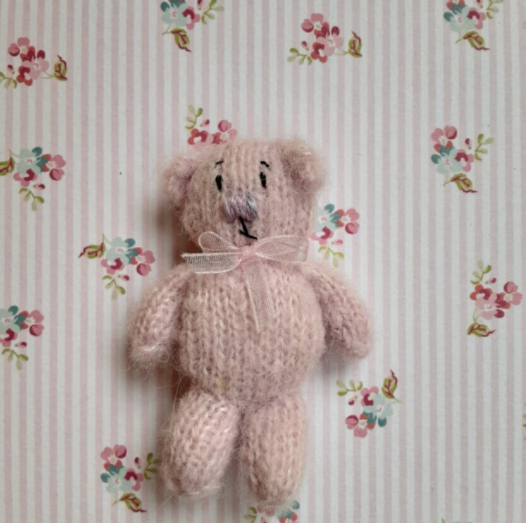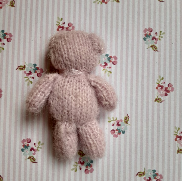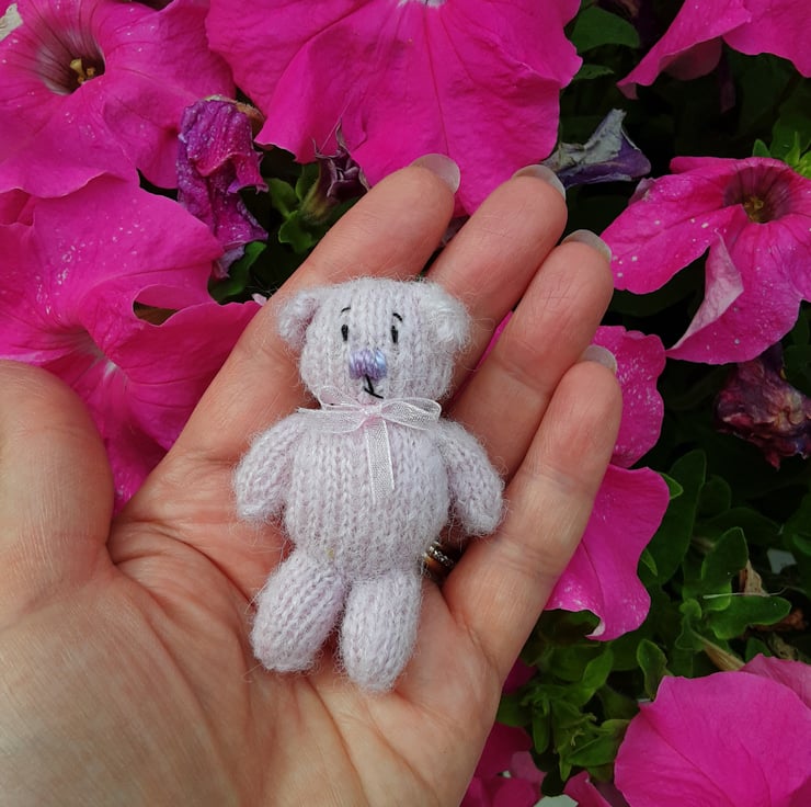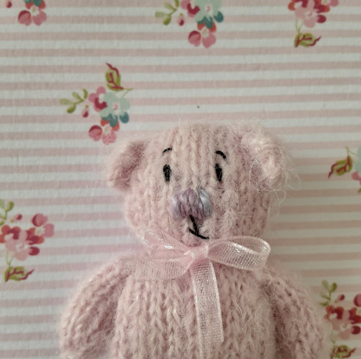 This little one is a mini flat bear and hand knitted using my own pattern. She is pale pink with a pale verigated lilac nose. Her eyes and mouth are in black embroidery thread. All hand embroidered by me.