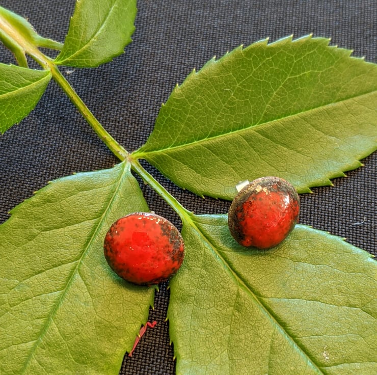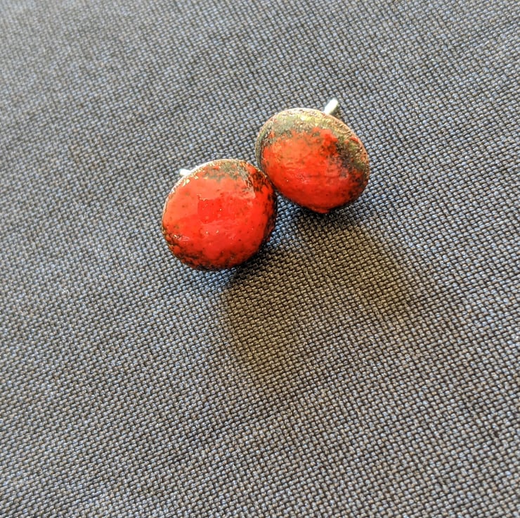 These simple but eye catching enamel earrings are made by shaping a piece of copper, then adding red vitreous enamel to it by heating it in my kiln. The red has an attractive blackened effect round the edges to add style and that boho look to the earrings.