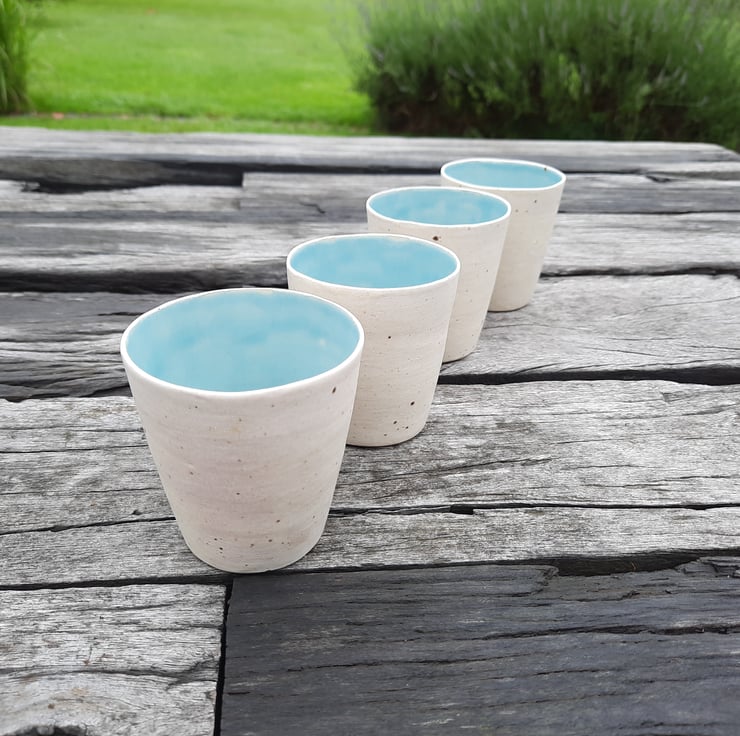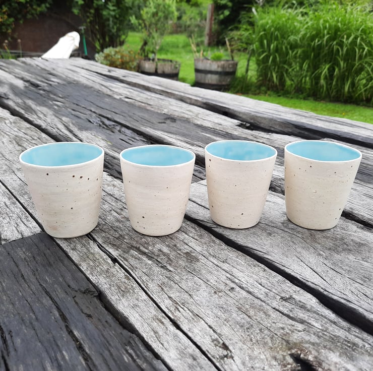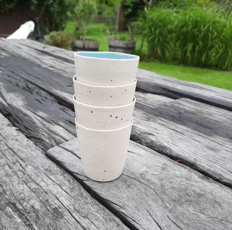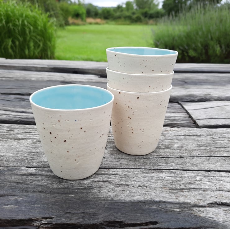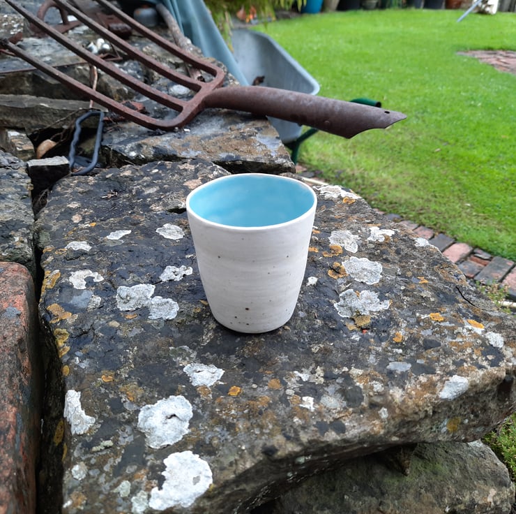 A ceramic tumbler/beaker for hot and cold drinks. A gloss pale turquoise glaze on the inside and a matt speckled cream glaze on the outside.
