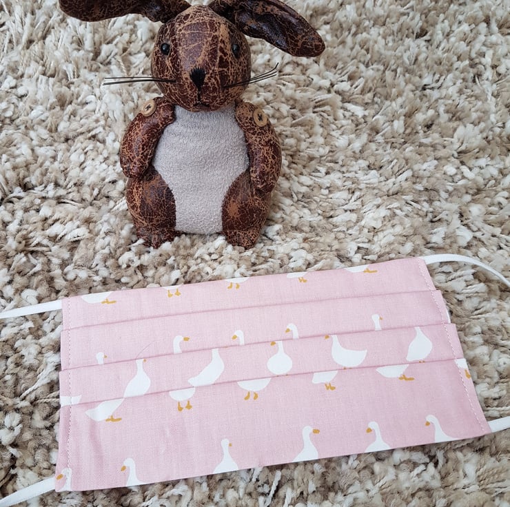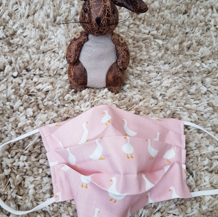 Adult face covering made from a duck print on pale pink cotton. The face mask is made with 2 layers of cotton forming an inner pocket for a filter (not included) and is fastened over the ears with 2 loops of elastic and a toggle adjuster.