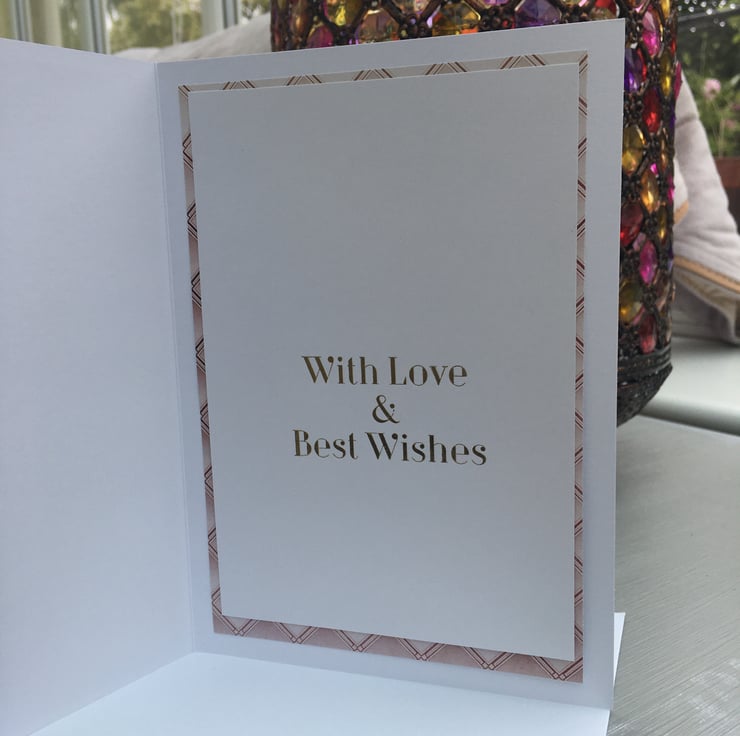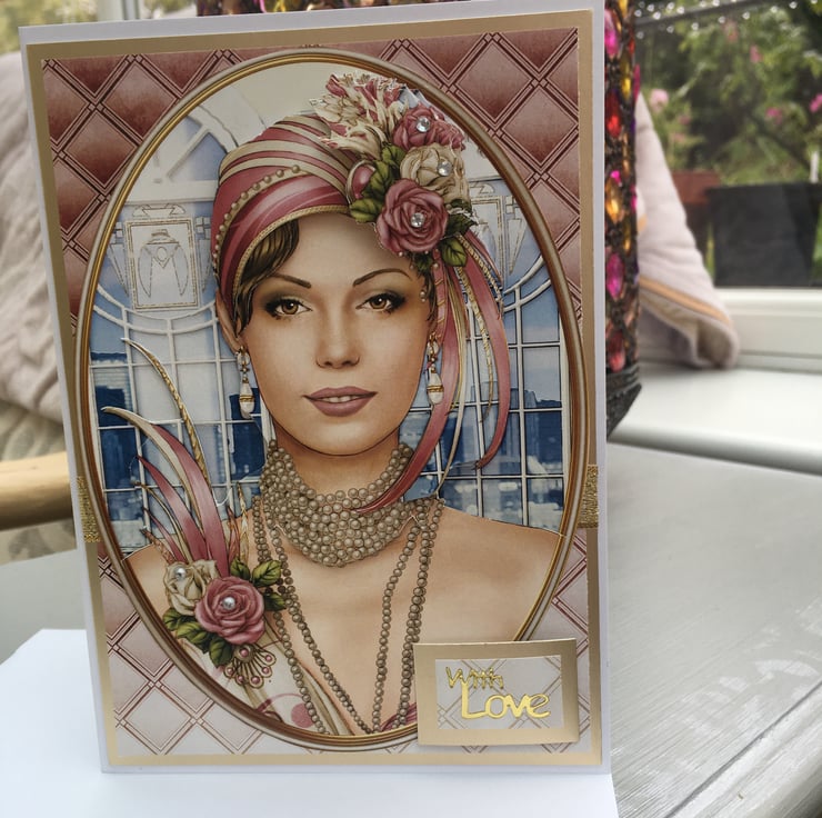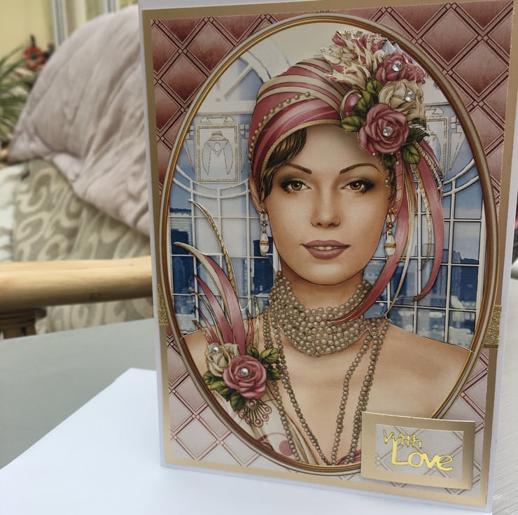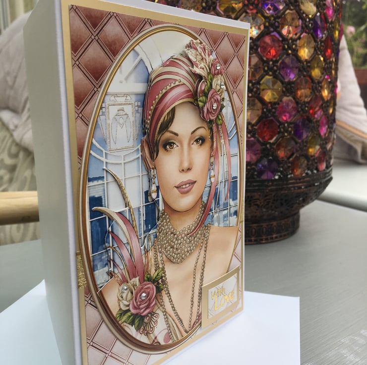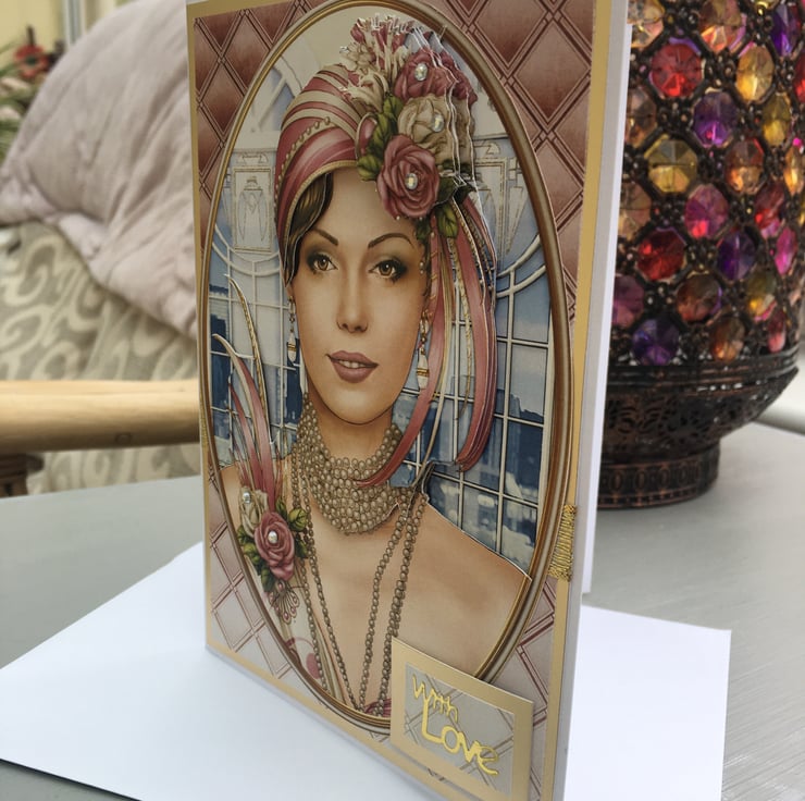 The glamour of the art deco period is undeniable, the clothes, the hats, the architecture. Instantly recognisable at a glance. This beautiful card has a lovley lady in a fantastic hat. The card is layered to give it dimention and finished with faux gems to add sparkle. The lady is in a stylish conservatory adorned with strings of pearls. The main image is mounted on matching deco style paper. A gold greeting says With Love and a gold ribbon finishes the design. Inside the card has a matching deco paper and a greeting which says With Love and Best Wishes.