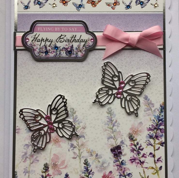 This is a beautiful luxury 3D handmade greeting card to send to that special person in your life. The design is 3D silver foiled butterflies mounted onto a field of wild flowers. The 3D greeting is silver foiled and says "Flying by to Say Happy Birthday". The 3D butterflies have also been hand-cut and silver foiled by me.