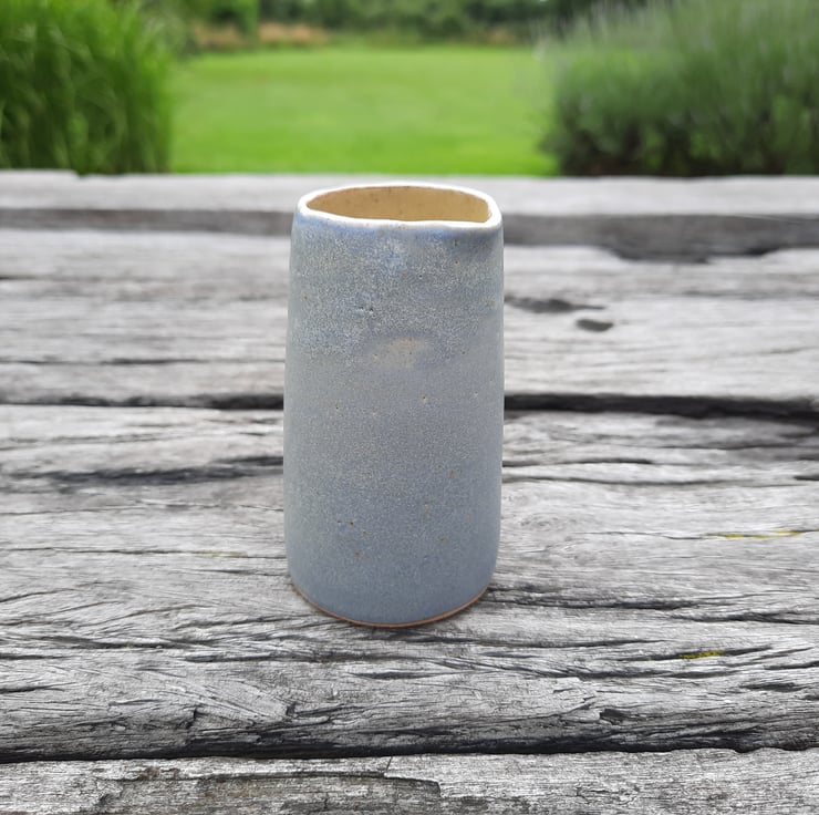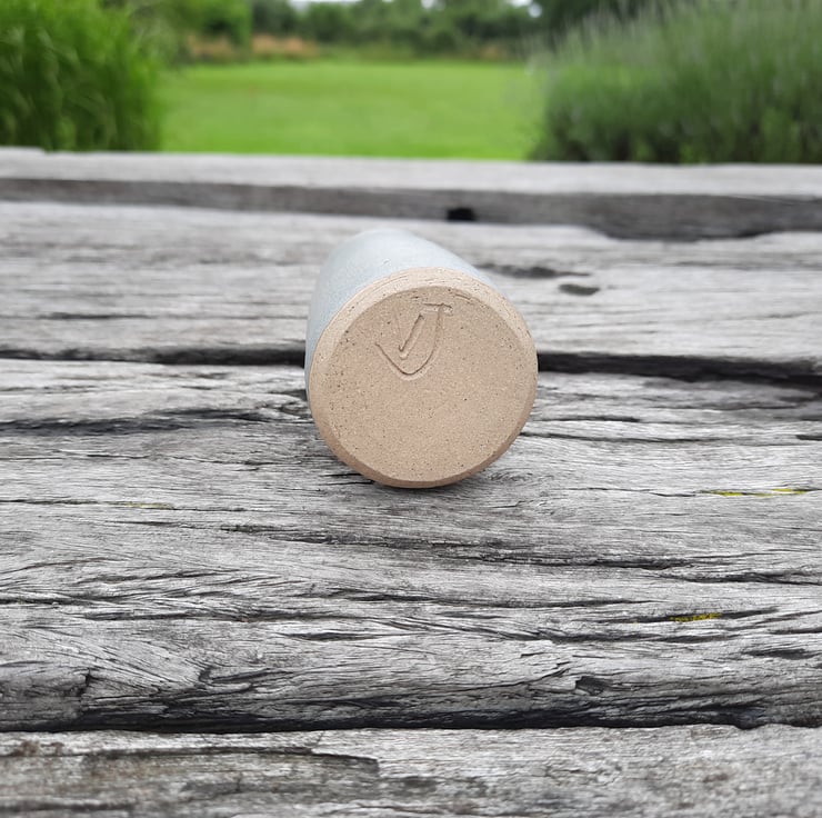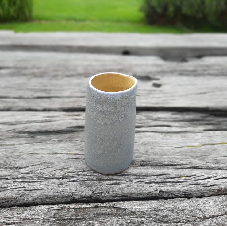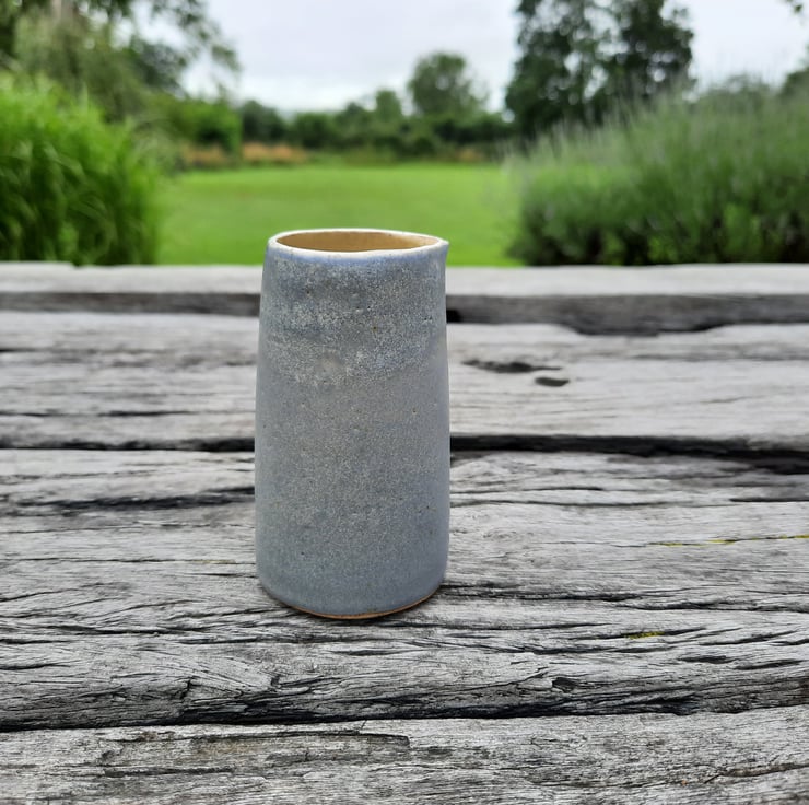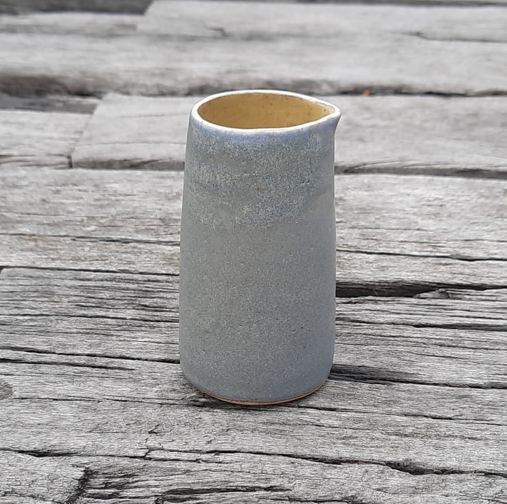 Small hand made ceramic cream/milk pourer. I have used a glossy yellow ochre glaze on the inside and a matt blue grey granite on the outside with a thin white rim.