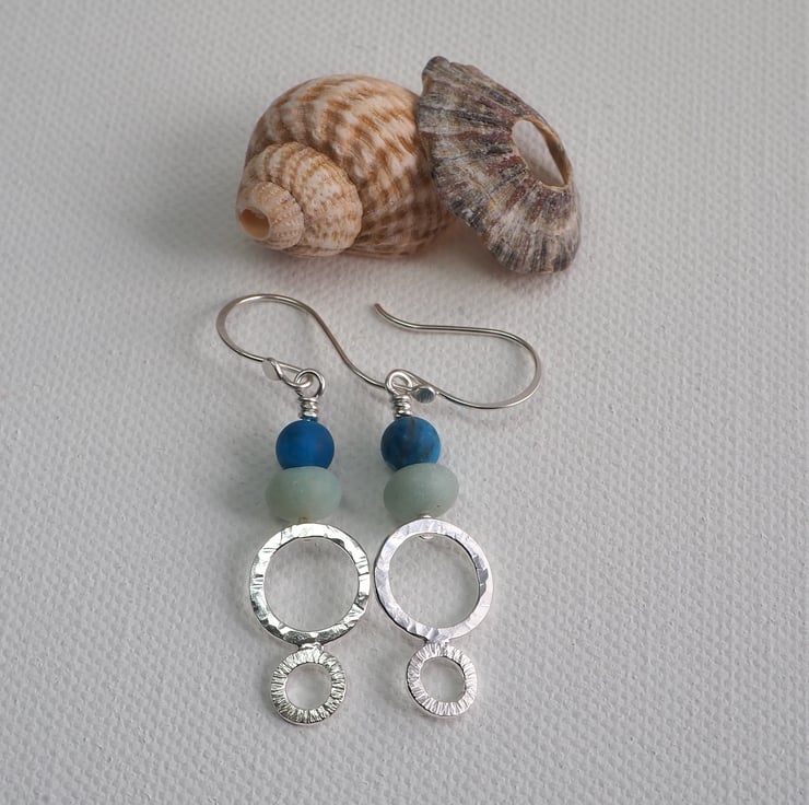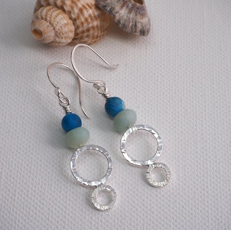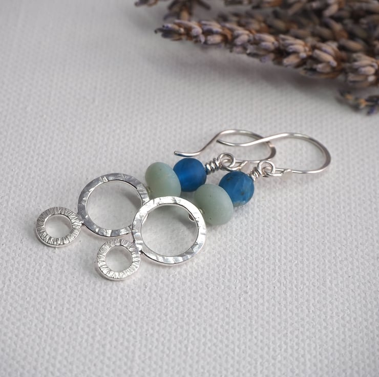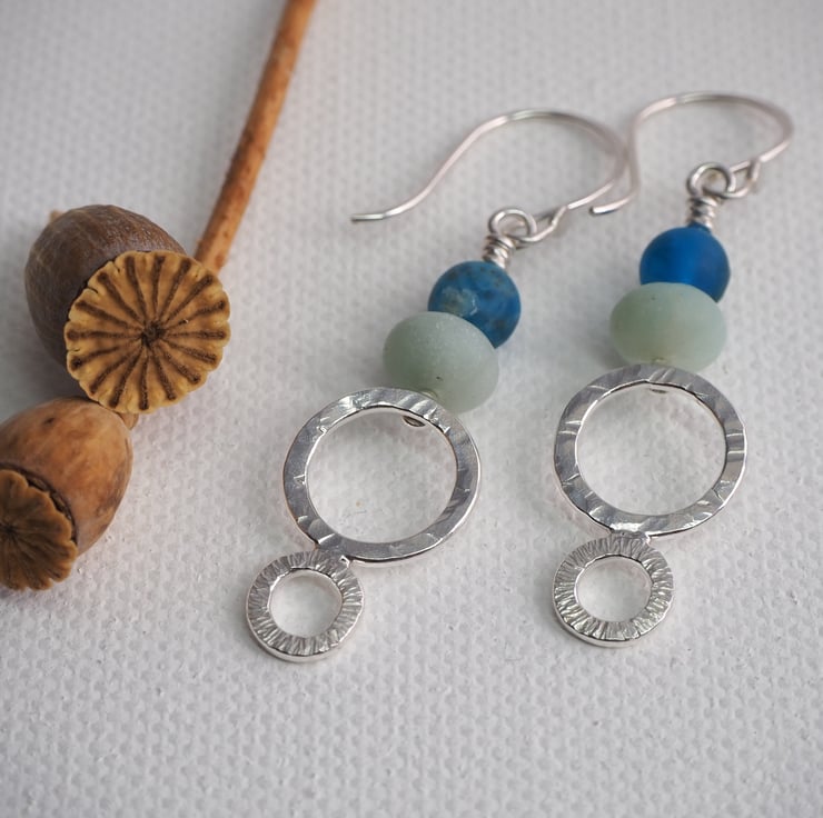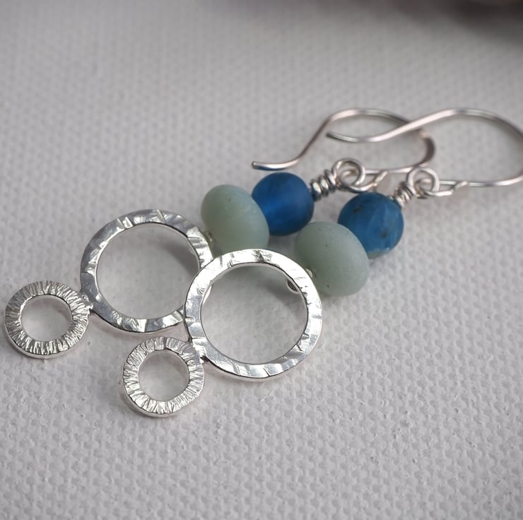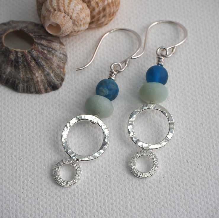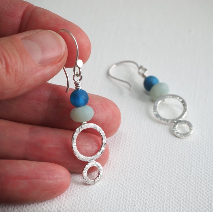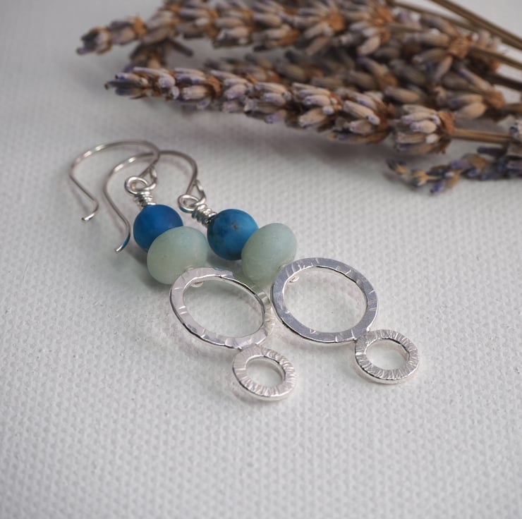 Long dangly silver earrings with frosted amazonite and apatite beads. The earrings have two hammered silver rings each with a different texture. The silver has been polished to a bright shine. These are long boho style earrings, perfect for dressing up an outfit.