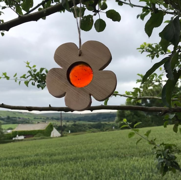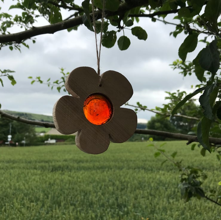Rustic Hanging flower sun catcher made from up-cycled solid wood, hand cut and sanded, drilled and a glass pebble approx size 3cm is inserted into wood, hung on jute string.