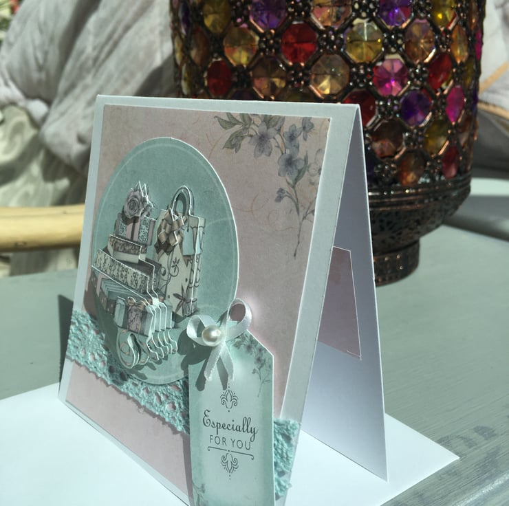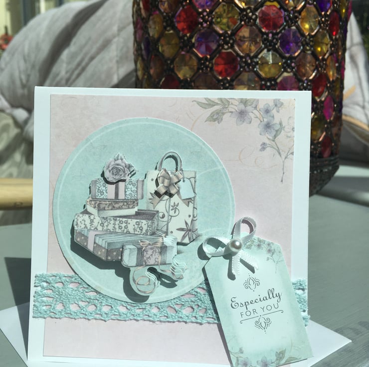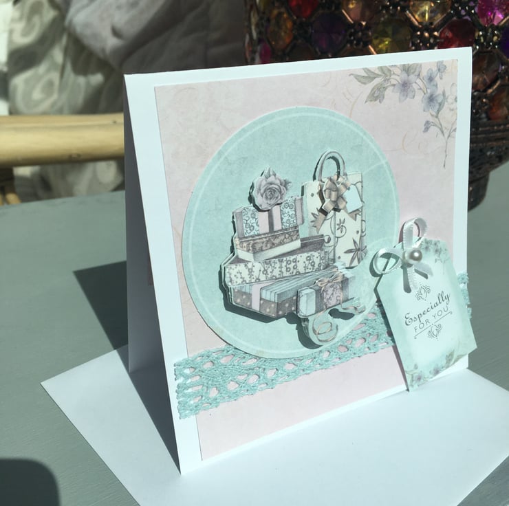A small neat birthday greeting. A huge pile of presents just for the birthday girl, who could ask for more. This petite card is delicate and pretty. A pile of gifts are layered up, enough to tempt any one! A delicate floral background is topped with pale duck egg crocheted lace. A matching tag says especially for you and is attached with tiny bow and pearl embelishment. Inside the card has a matching banner and Happy Birthday greeting.