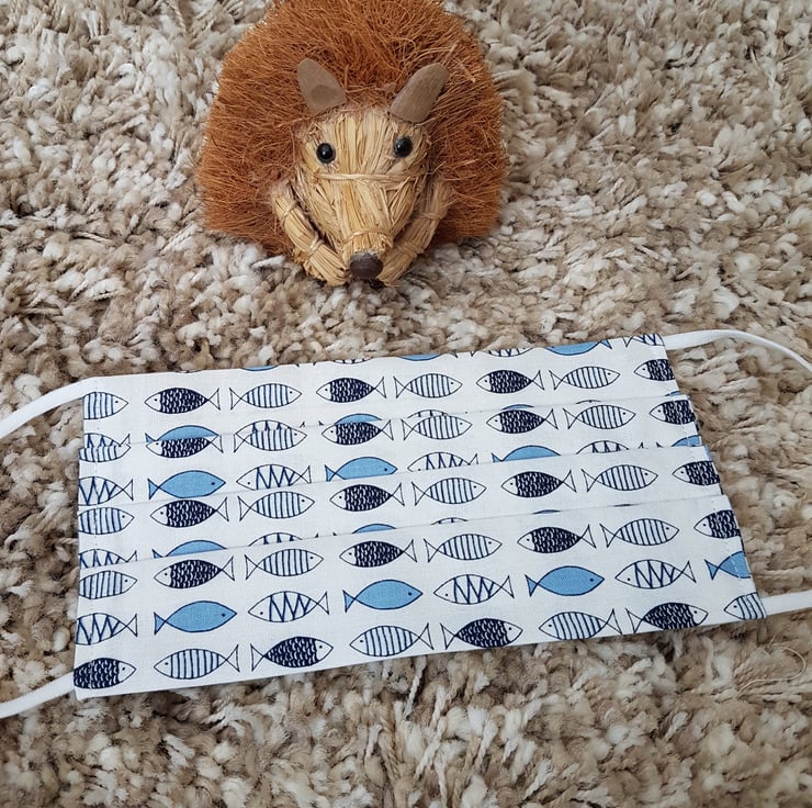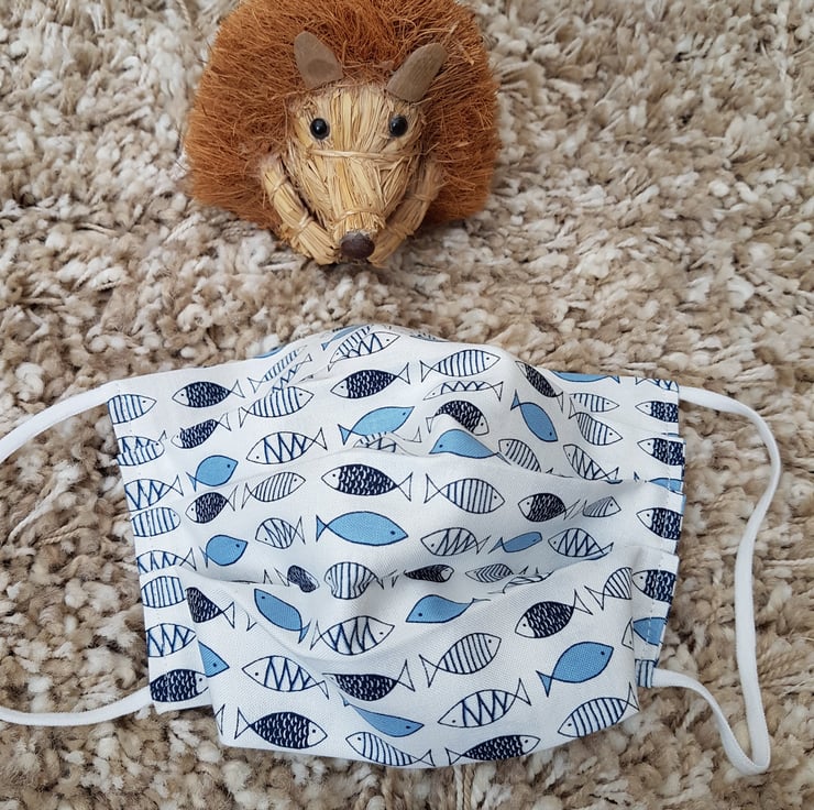 Small Adult/Teenager face covering made from a blue fish print on ivory cotton. The face mask is made with 2 layers of cotton forming an inner pocket for a filter (not included) and is fastened over the ears with 2 loops of elastic.