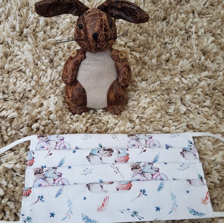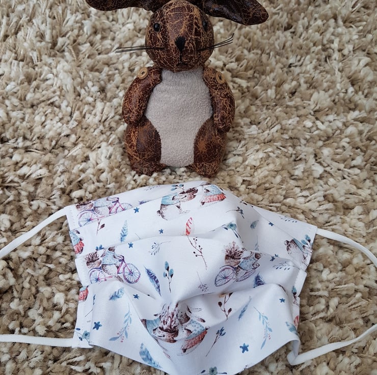 Adult face covering made from a bunnies on bicycles print on ivory cotton. The face mask is made with 2 layers of cotton forming an inner pocket for a filter (not included) and is fastened over the ears with 2 loops of elastic and a toggle adjuster.