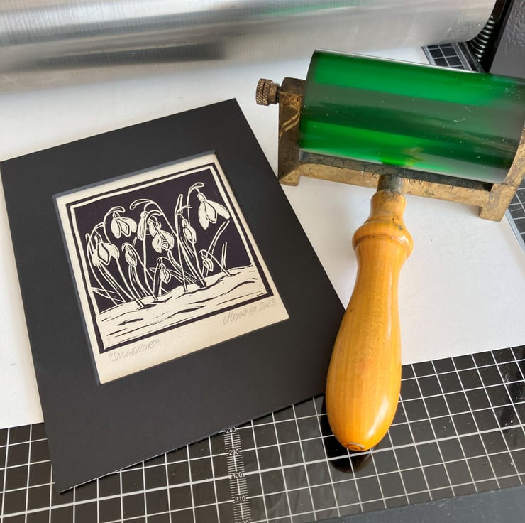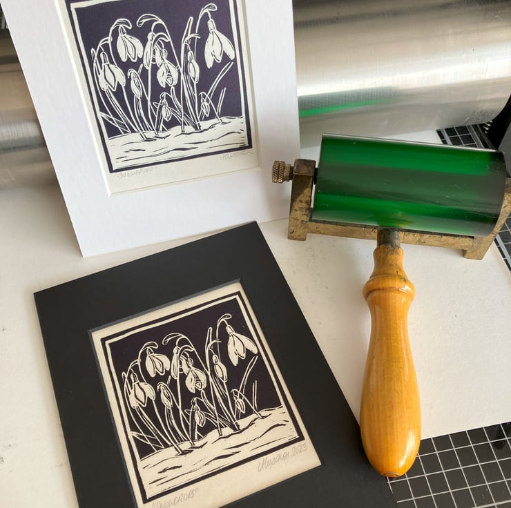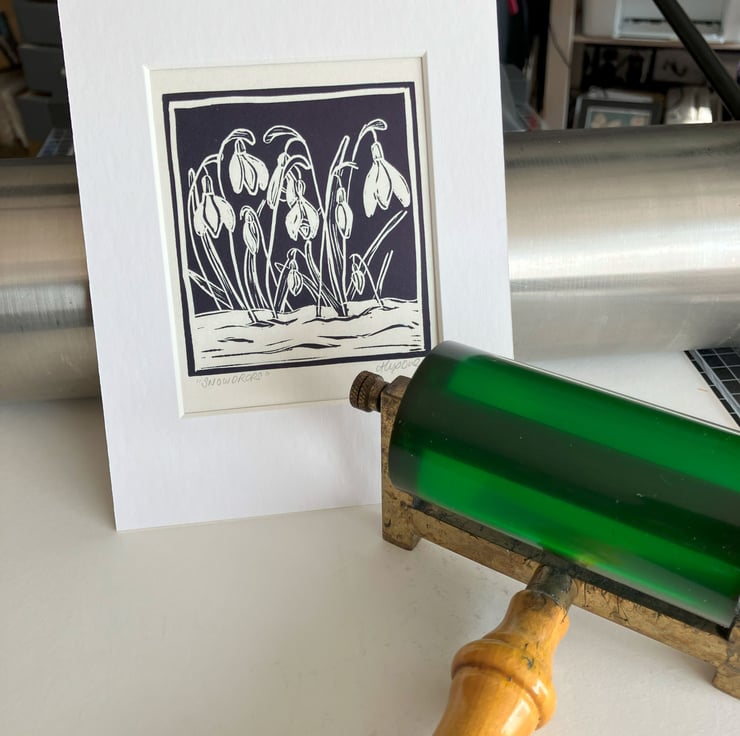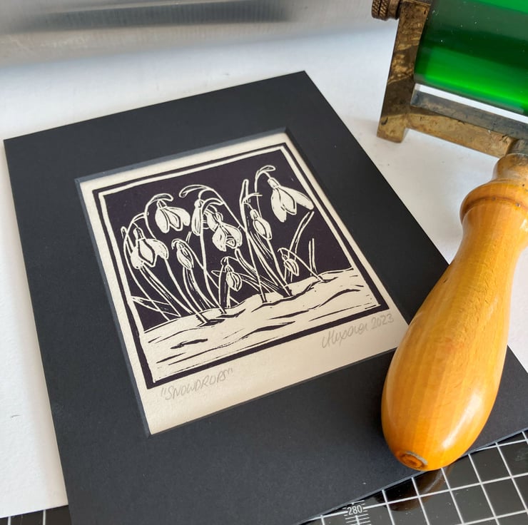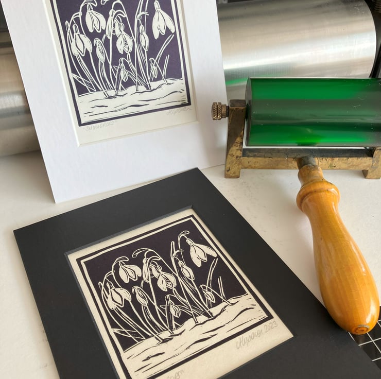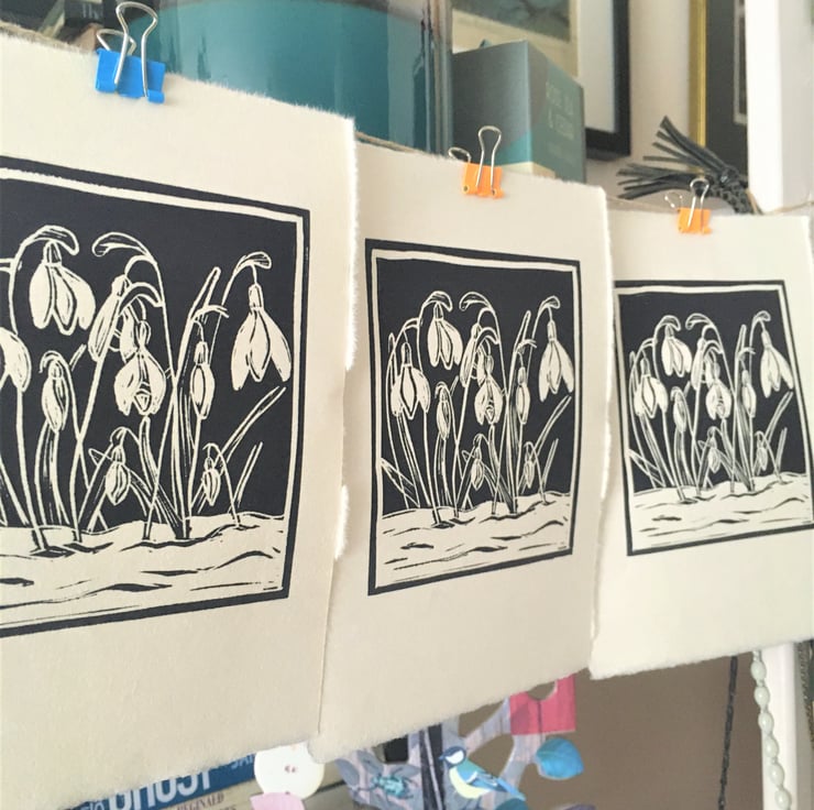 My small "Snowdrops" print is created using the relief printmaking method of linocut printing. As each print is created by hand there may be tiny variations which add to the individual beauty of each original artwork. Small "Snowdrops" is printed onto Bunkoshi 70gsm printmaking paper from the Awagami factory in Japan.
