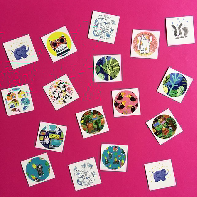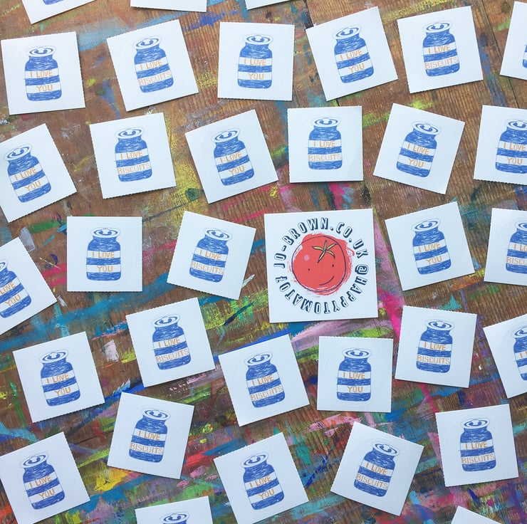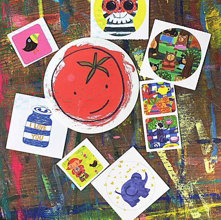 A random selection of glossy paper stickers based on my card designs -will include one large tomato sticker, four medium 38 mm round stickers, and four tiny square stickers