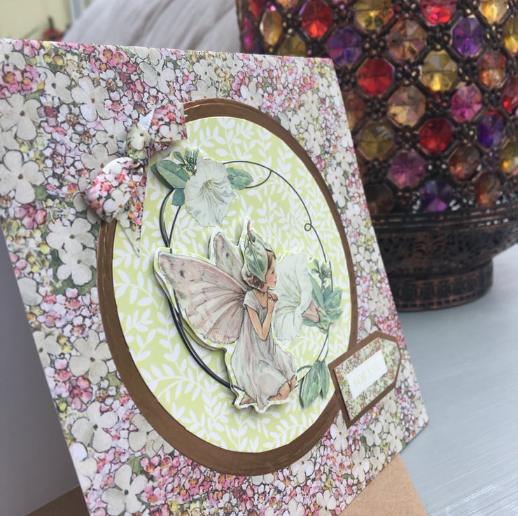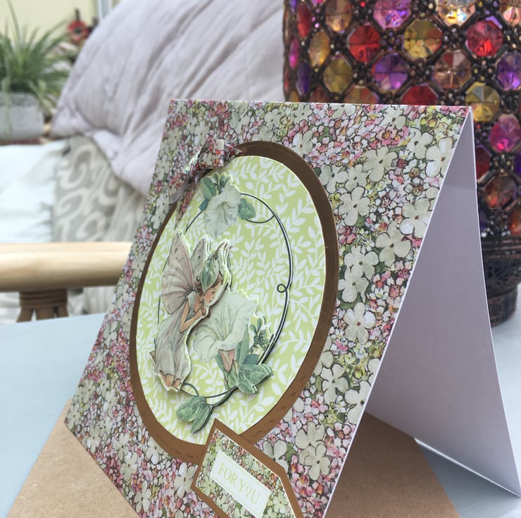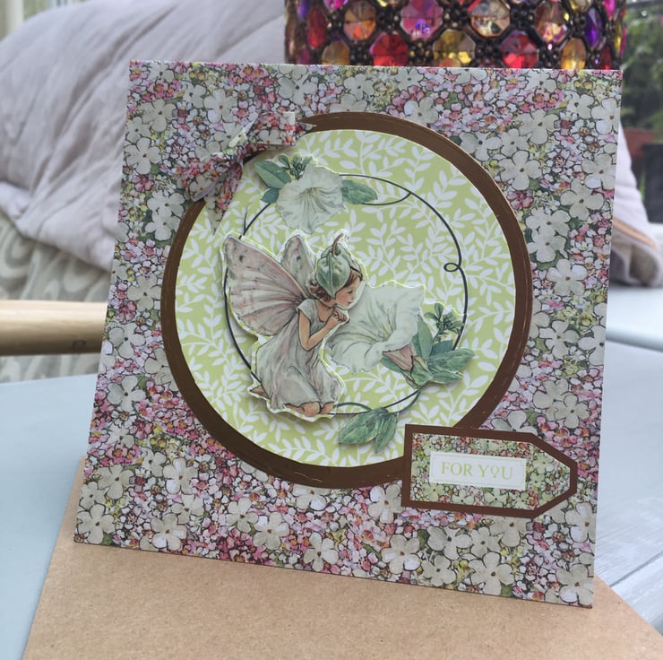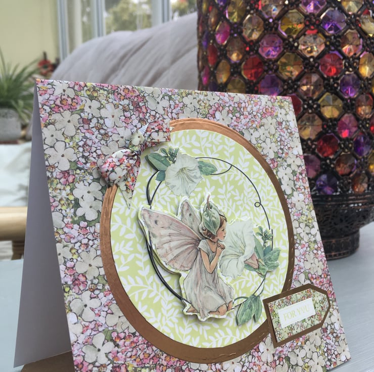 Lovely Edwardian fantasy, lovely flower fairies from Cicely Mary Barker. This card will make any fairy fan very happy. A little fairy adorns the front of this card, she is gazing into a white morning glory flower. This layered round topper is mounted on top of a copper circle and this is on a matching ditsy floral paper. A matching bow finishes the design and the greeting says For You. The card is blank inside for your own greeting. The card comes with a kraft card envelope.