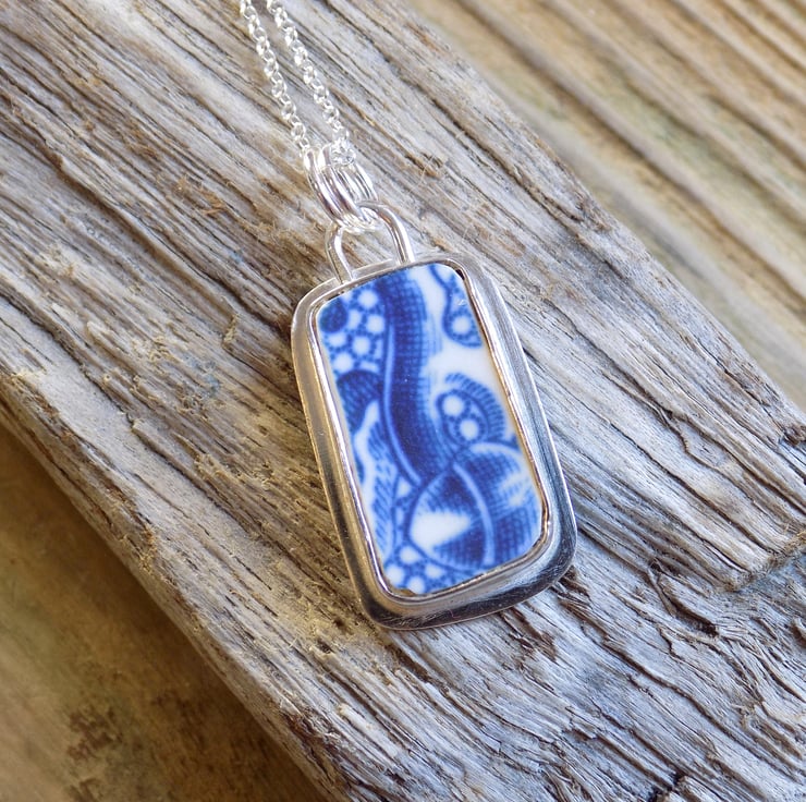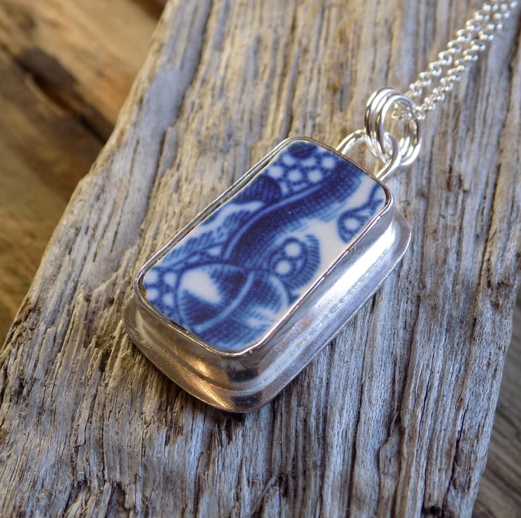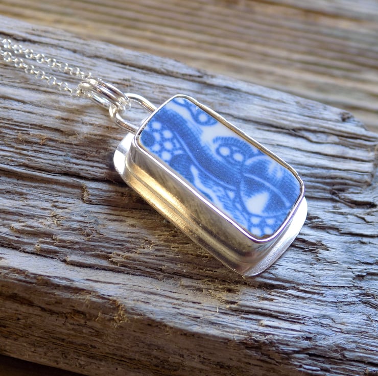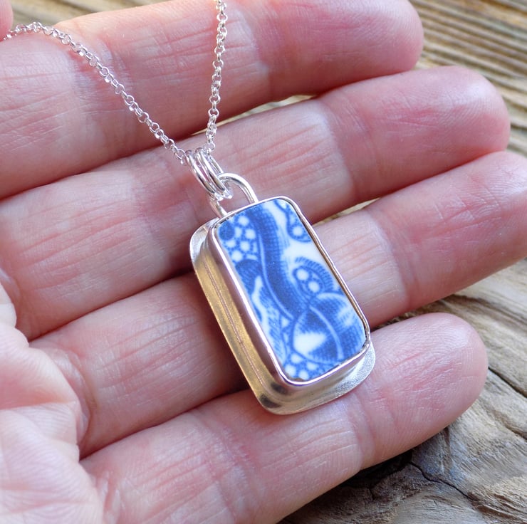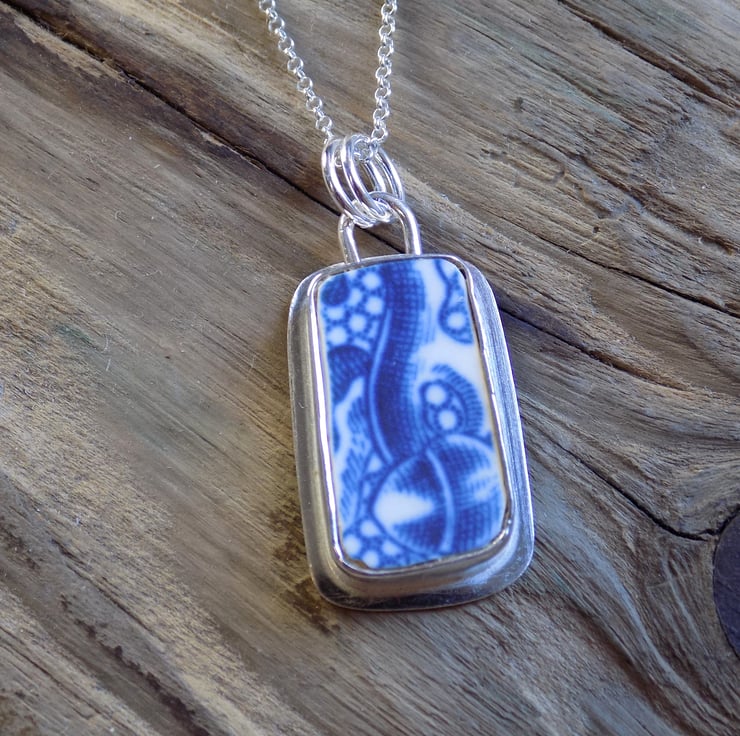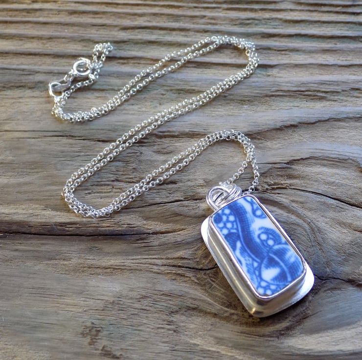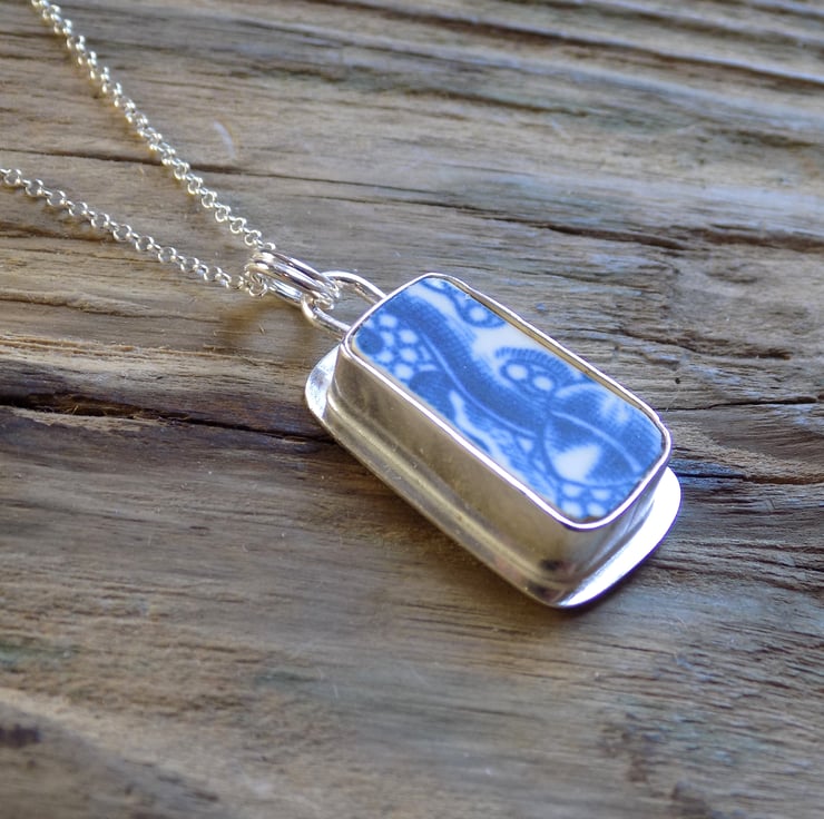 Made from old broken tumbled pottery and sterling silver. The pottery is not sea worn but it is pretty beautiful, set within a custom made bezel which really sets it off. Simply suspended from an 18 " sterling silver belcher chain (marked 925).
