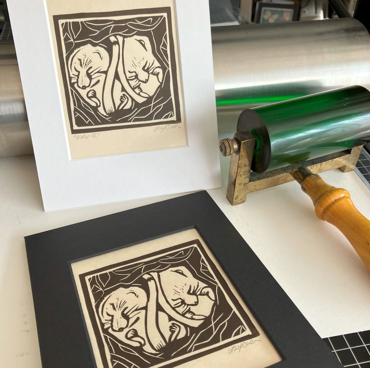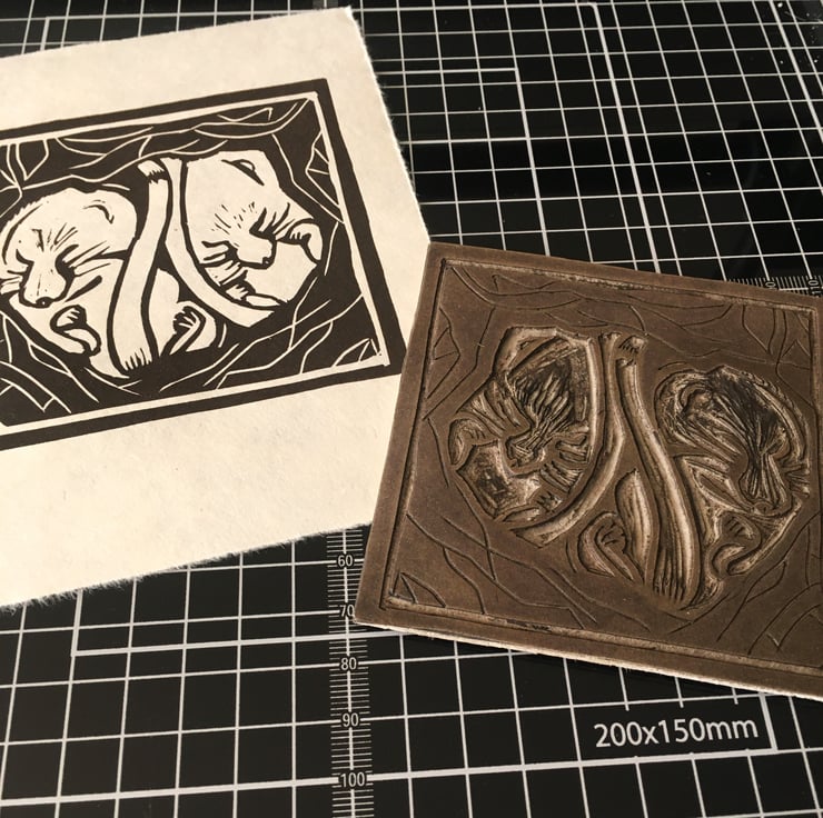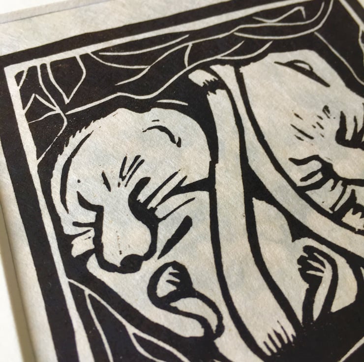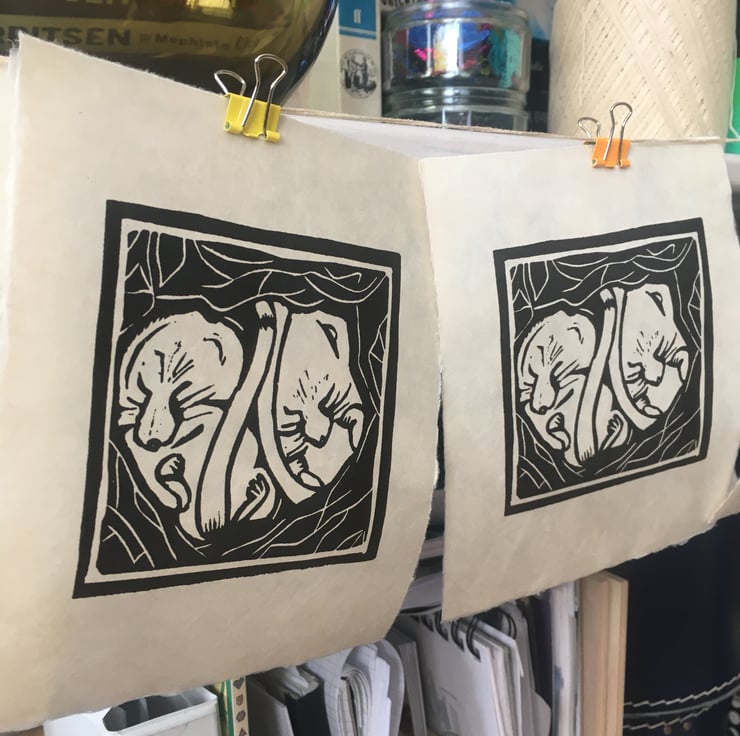 "Dormice" is created using the relief printmaking method of linocut printing. As each print is created by hand there may be tiny variations which add to the individual beauty of each original artwork. "Dormice" is printed onto Kitakata 36gsm printmaking paper from the Awagami factory in Japan.