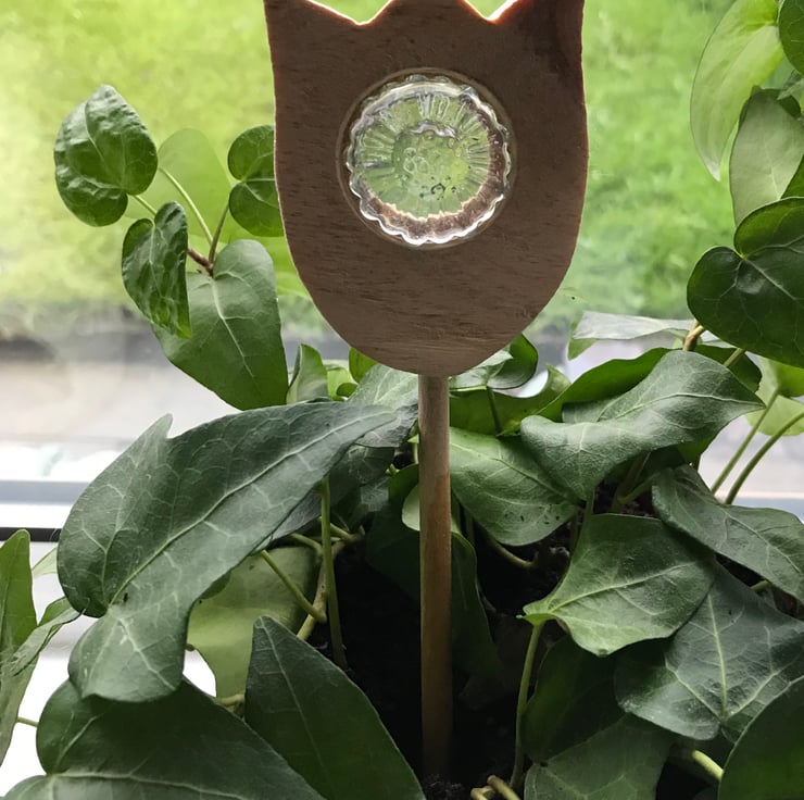Rustic handmade wooden Tulip with decorative glass sunflower pebble. The tulip as a wooden doweling stick inserted into the base which allows the stick to be placed in a plant pot on the windowsill.