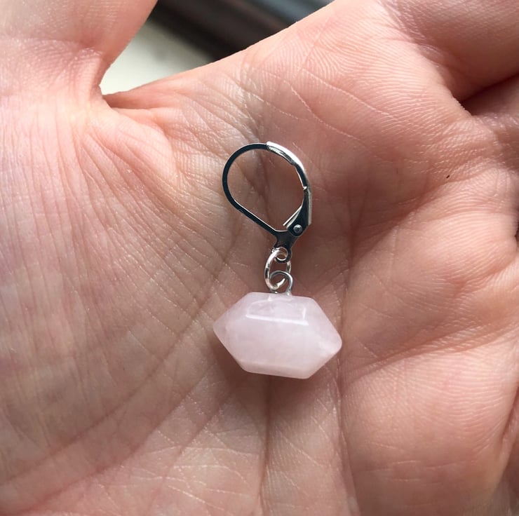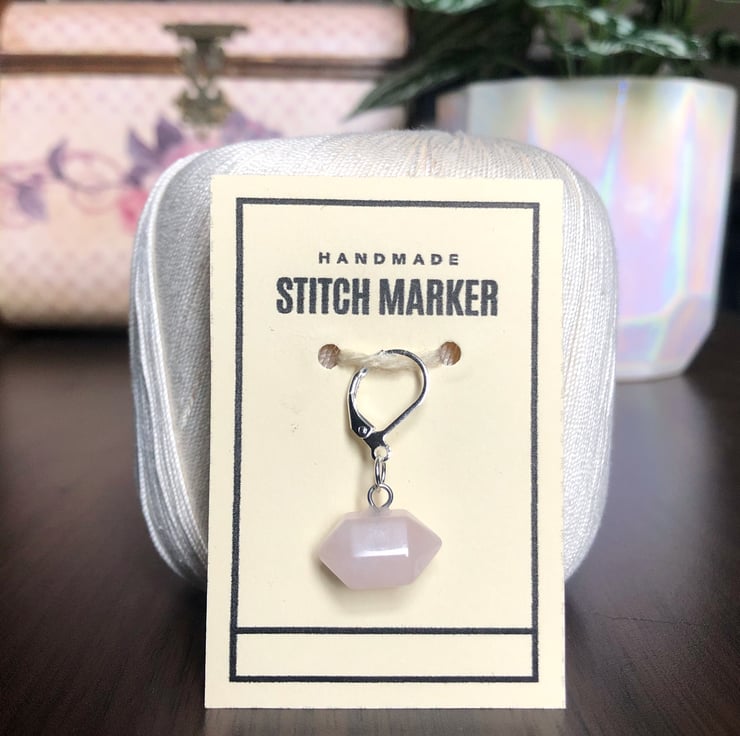 Rose Quartz semi-precious gemstone stitch marker for knitting or crochet. You can choose either a silver lobster claw clasp (as in cover photo) or a larger, lever back clasp (photo 2). The rose quartz is a 16mm x 10mm Pillar point stone.