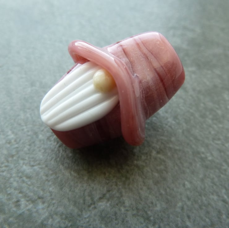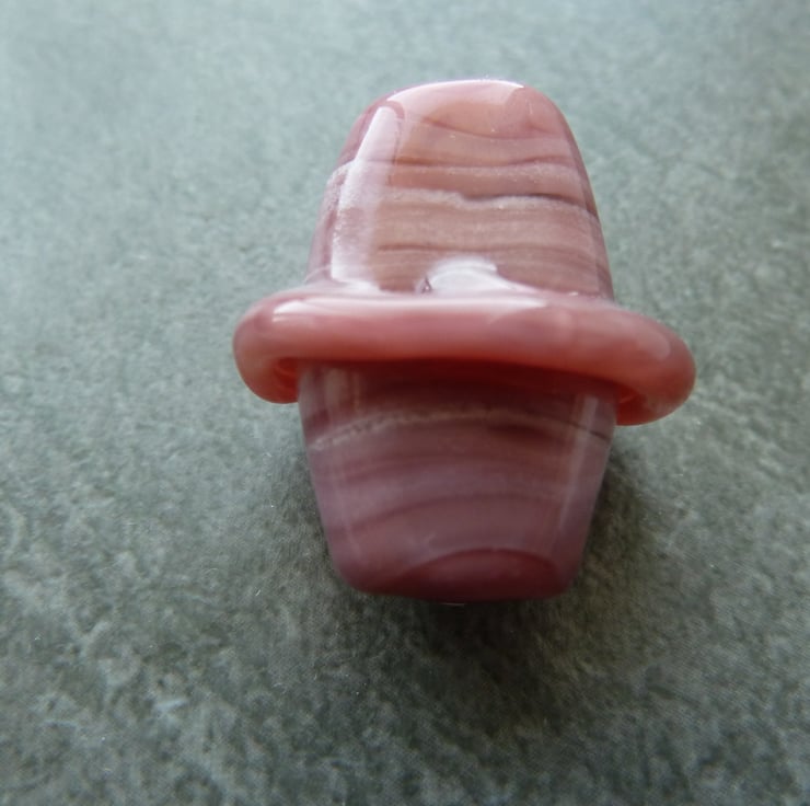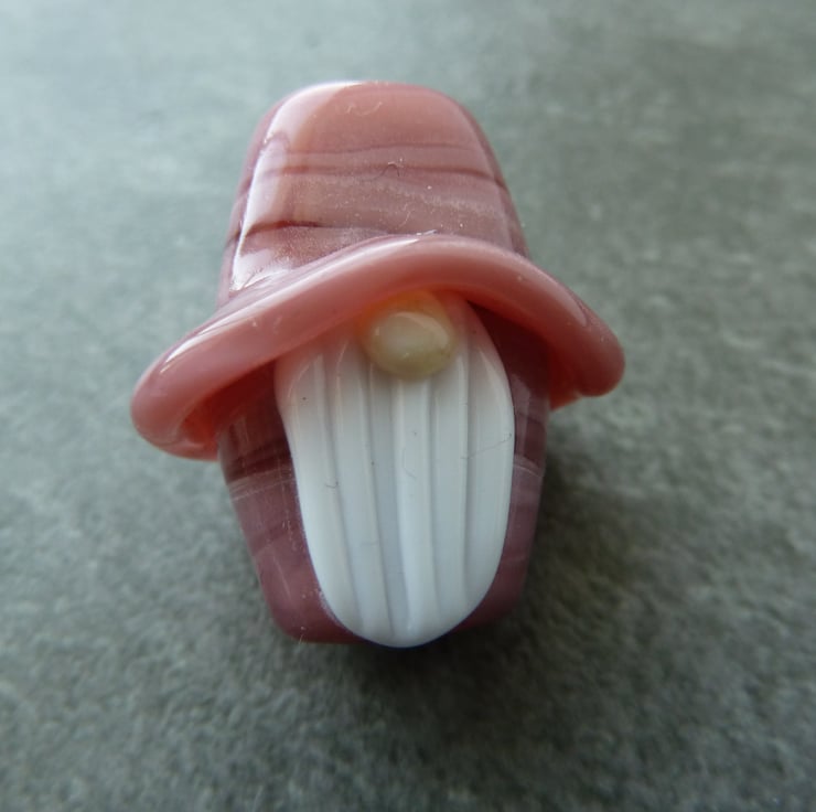 A lampwork glass gnome bead made with pink glass, he has a white beard and a floppy hat.