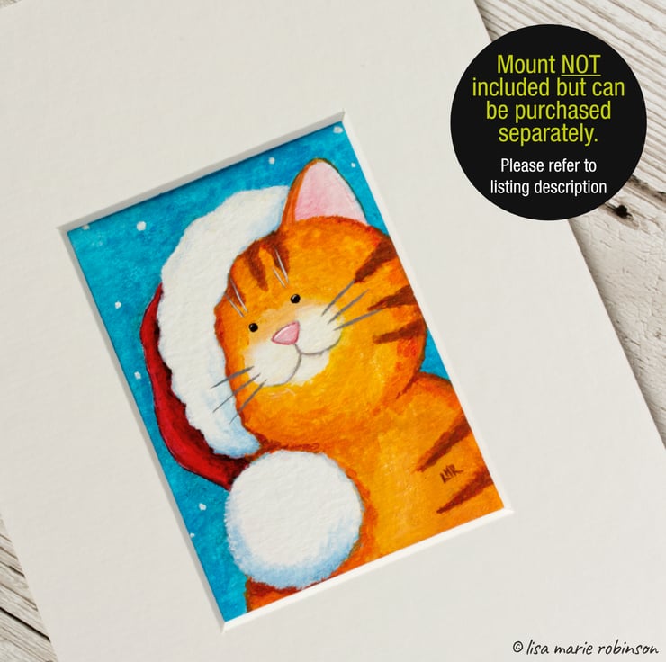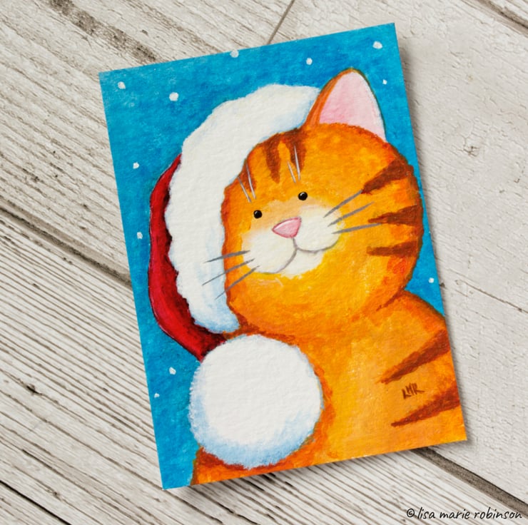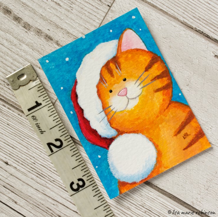 Original ACEO painting of a cute ginger tabby cat wearing a Santa hat.