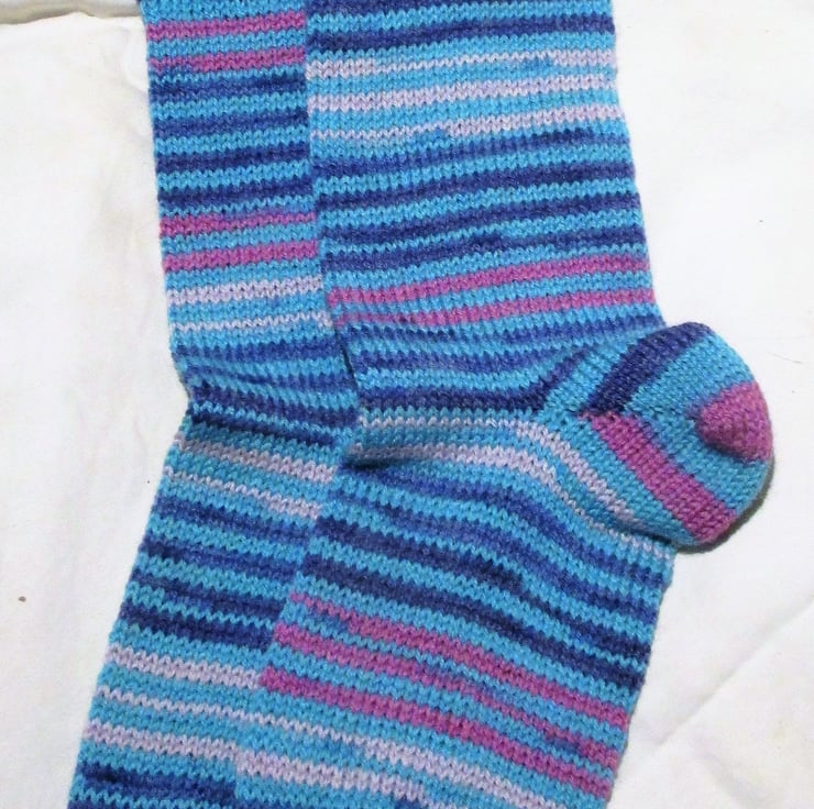 These socks were inspired by the colours and the feel of the yarn, the colours of this yarn reminds me of a rhyme we used to sing as kids..it went....'Pink and blue will never do, it'll make all the boys wink at you..' Yes, these lush socks will make you smile ......