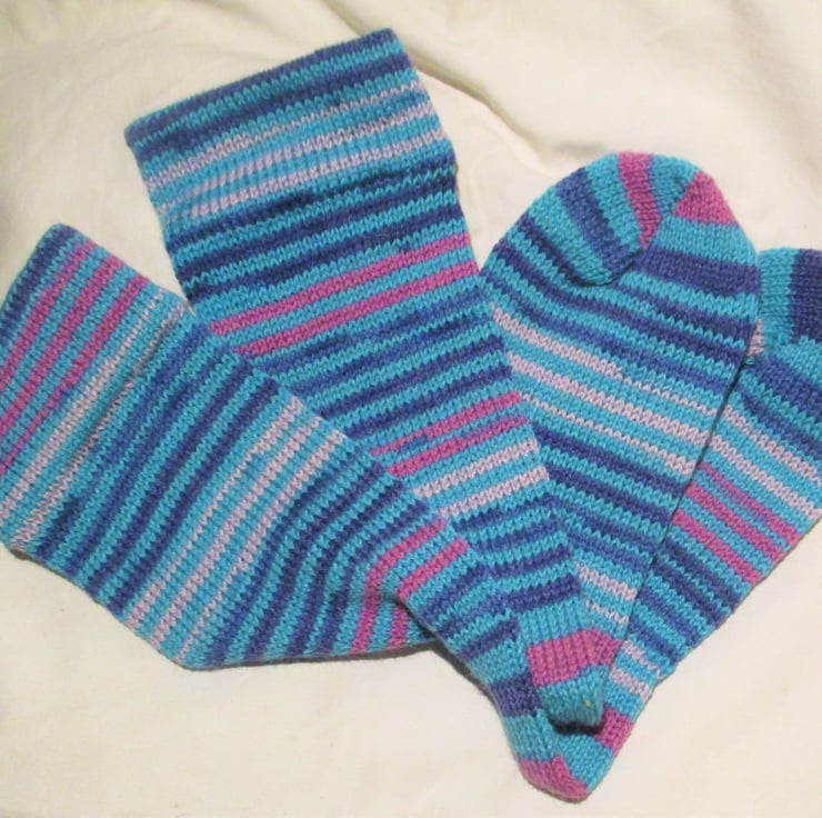 The socks are made toe up so there are no seams in the toe and I crochet them closed at the top on the inside so that they are extremely comfortable. They stay up but do not cling to your leg.