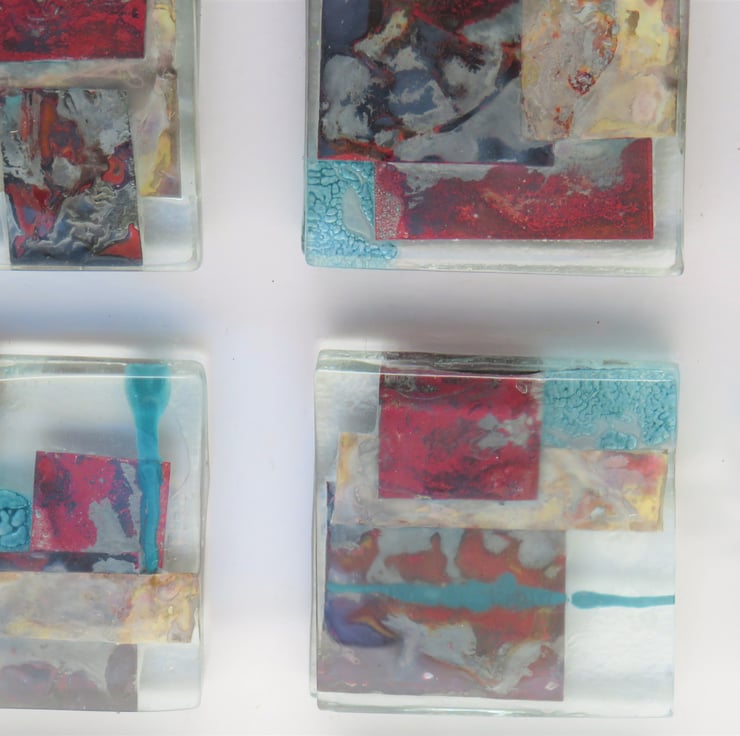 It has been made from recycled glass and consists of 9 small squares each individually cut and decorated with enamels and metal inclusions. Each square contains unique patterns and textures they have then been mounted in a simple white frame.