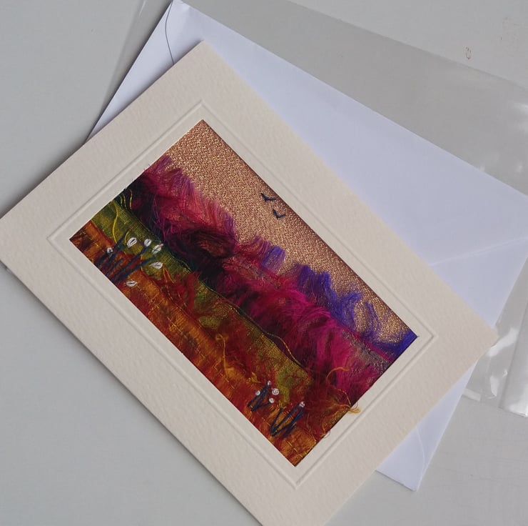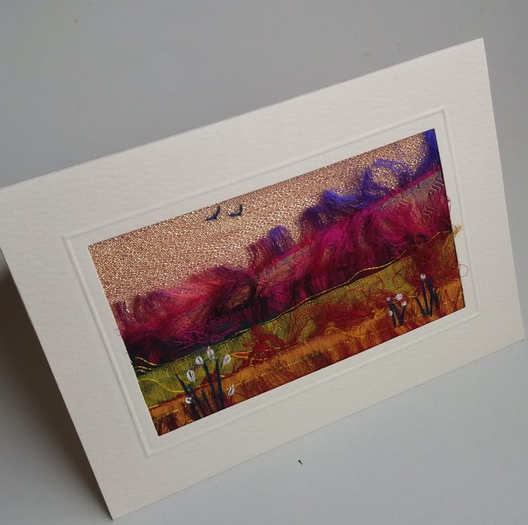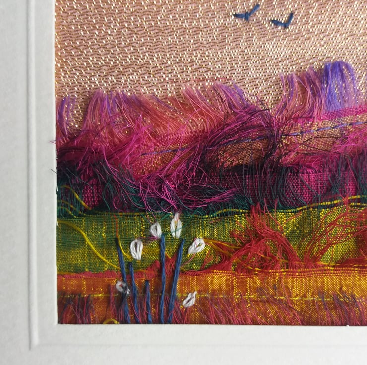 Put together from a combination of sari silk ribbon scraps, sparkly fabric from my stash and with embroidery detail, to create a stunning colourful landscape.
