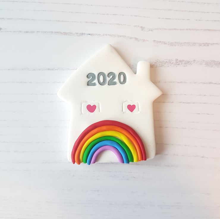 This little house shaped decoration is made of polymer clay, with 2020 stamped by hand using mini individual numbers, and detail hand painted using acrylic paint to finish. A rainbow is added using different colours of polymer clay.