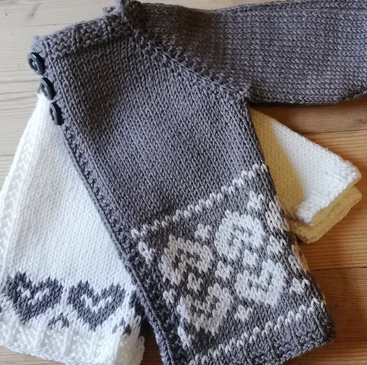 This pretty baby cardigan is knitted in DK, soft, light, wool cotton. It is designed with a pretty double heart motif and edged in an attractive garter stitch rib.