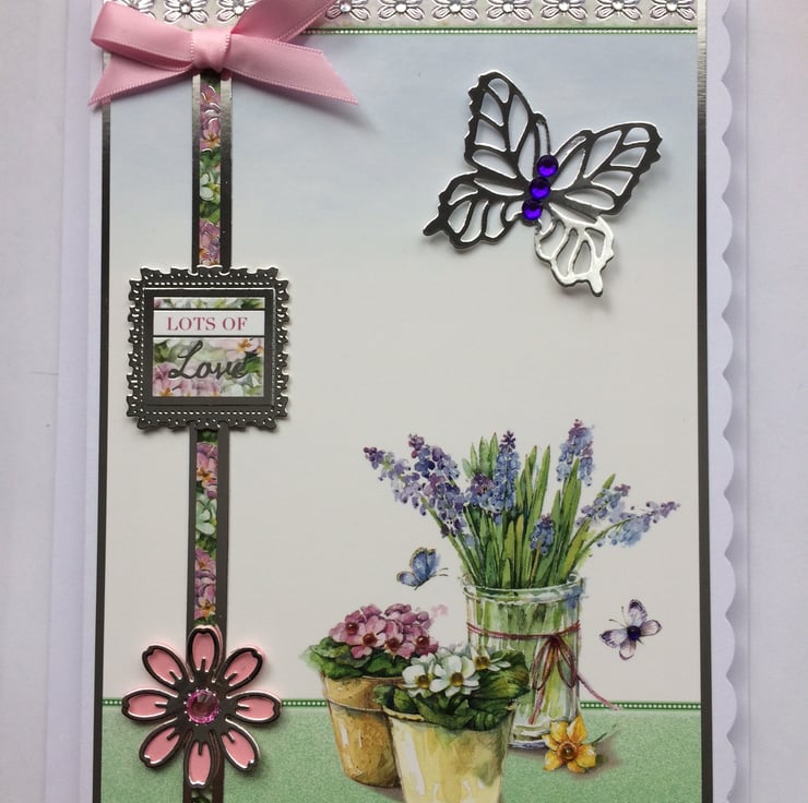 This is a beautiful luxury 3D handmade greeting card to send to that special person in your life. The design is potted plants sitting next to a vase of wildflowers with a couple of butterflies fluttering around them. The 3D greeting is hand-cut and silver foiled and says "Lots of Love". The 3D butterfly and 3D flower have also been hand-cut and silver foiled by me.