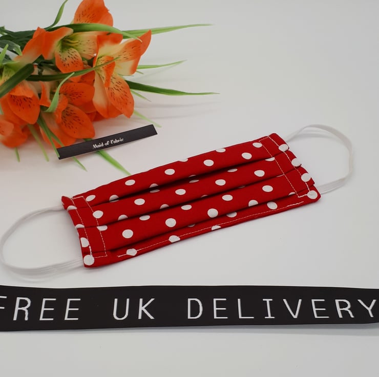 Face mask made using a bright red and white polkadot fabric and white elastic.