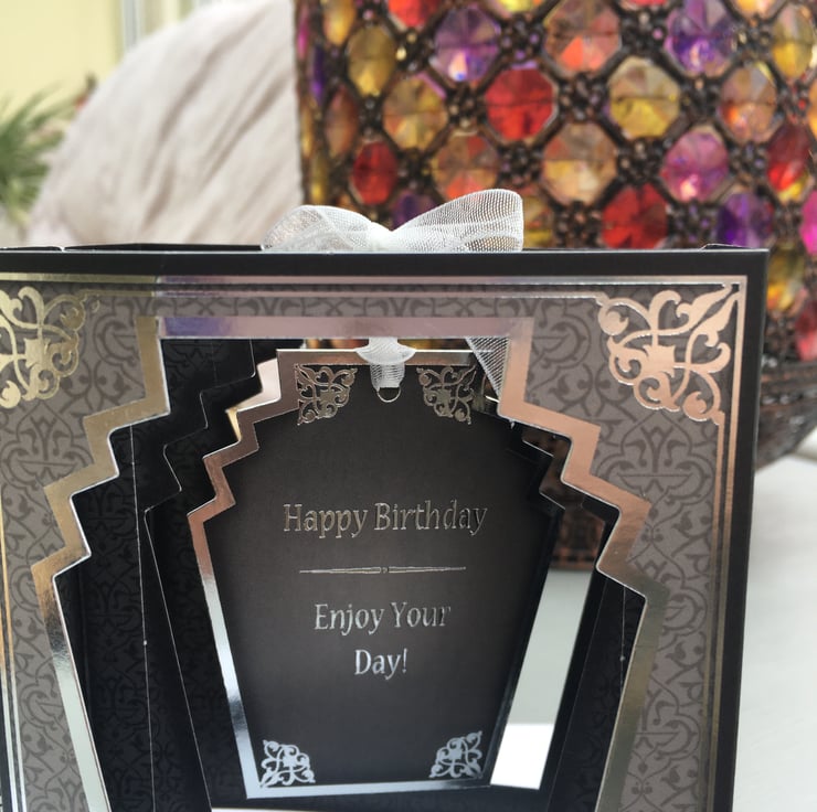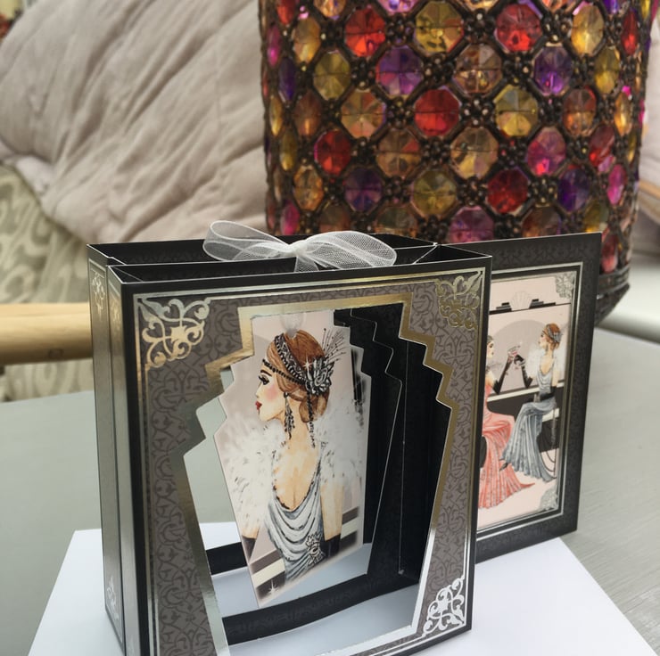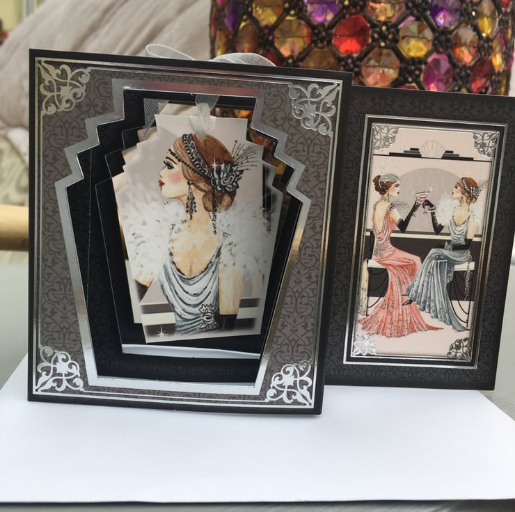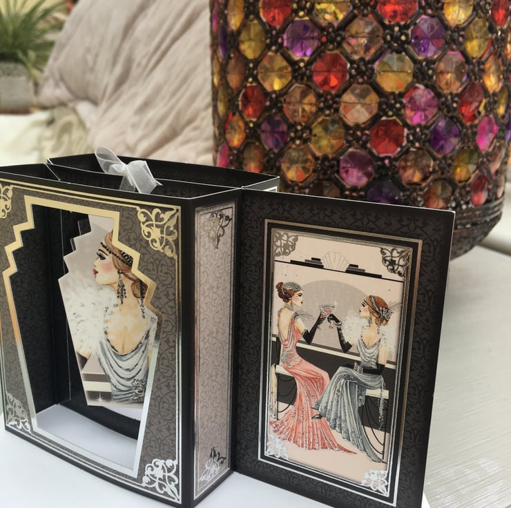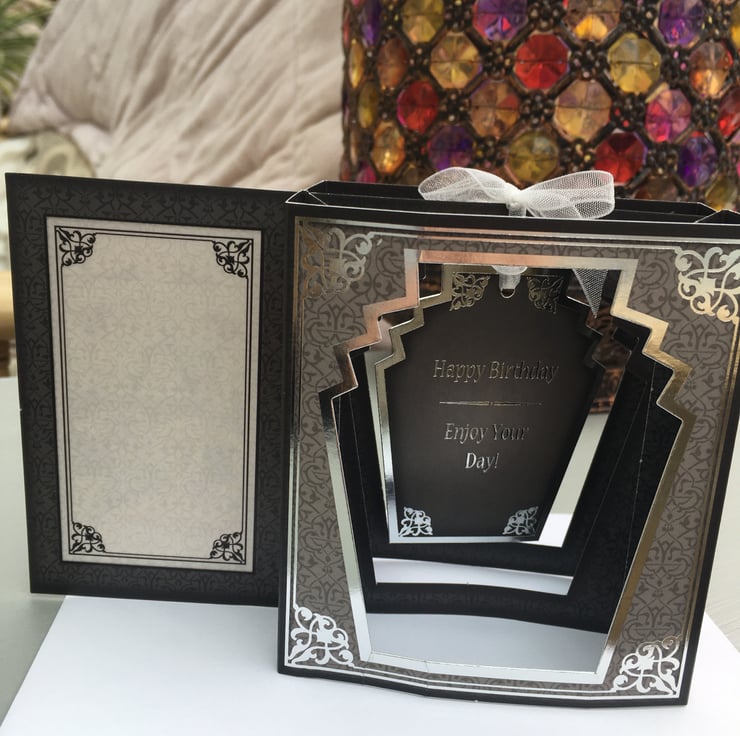The glamour of the art deco age is personified by this unusual box card. 2 glamorous ladies are sipping cocktails to celebrate a special occation. This unusual card has a box shape that folds completely flat for posting. The inner shape holds a hanging frame with a fabulous lady on it. The card is predominanly black and grey with silver scroll borders to give a dramatic effect. The greeting is Happy Birthday, enjoy your day. There is a small section for your own greeting. It comes with a plain white envelope. A very unusual card.