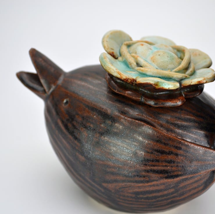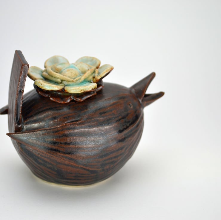 Hand built with a decorative flower stopper, glazed in a lovely pool blue. The carving on the surface is accentuated by the glaze, which is almost black, then brown. Fits into your hand as if you had tamed it yourself.
