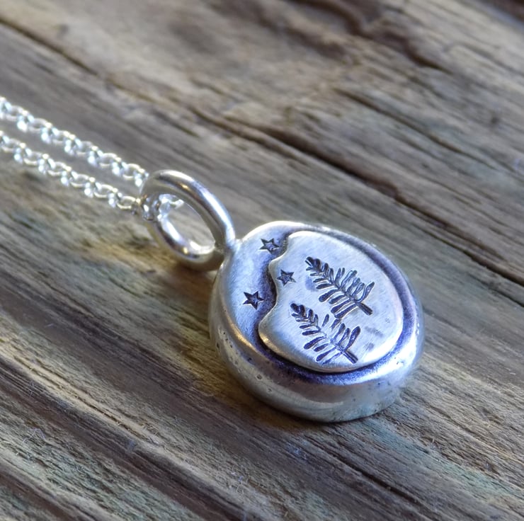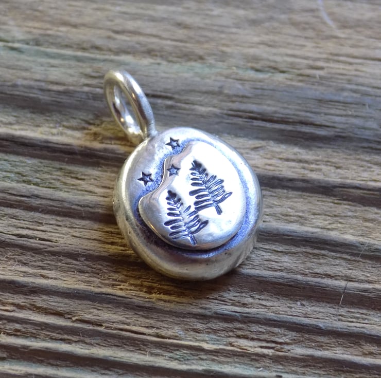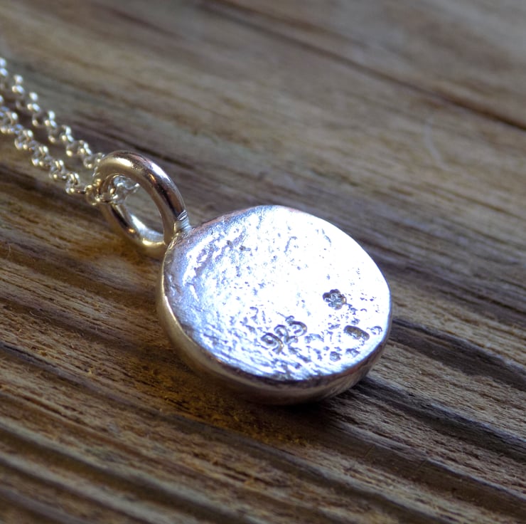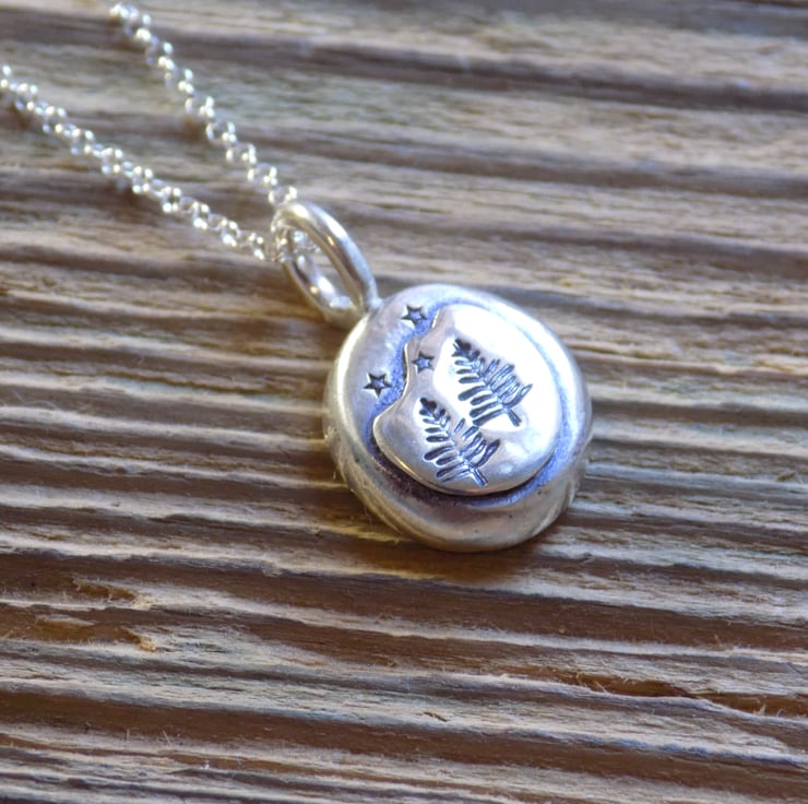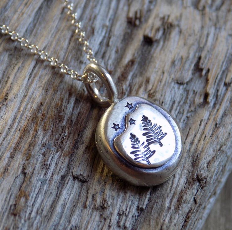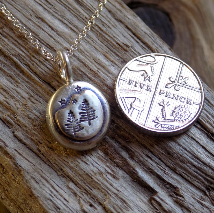 Made from off cuts off silver, meted down and and formed into a nugget. This particular one has a chunky look , with the addition of another layer of silver and stamped trees it makes for a rather cute and unique little nugget pendant. A thick jump ring has been soldered to the top and it hangs on an 18 " sterling silver belcher chain.