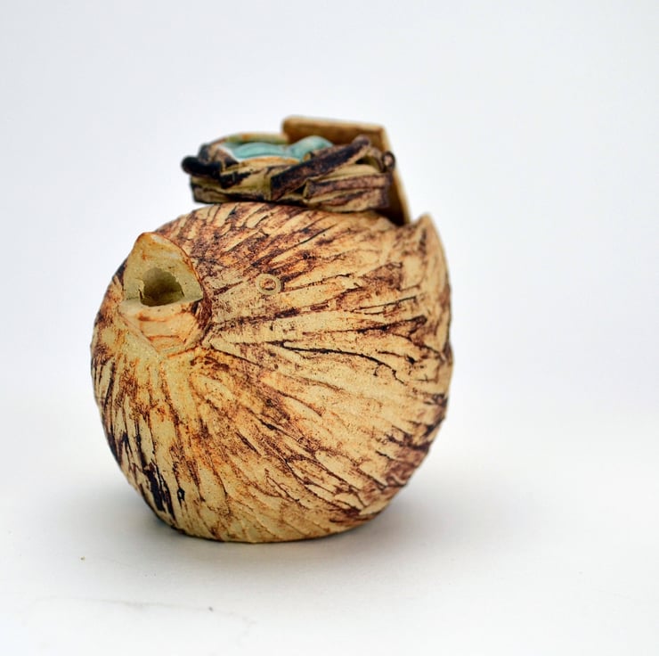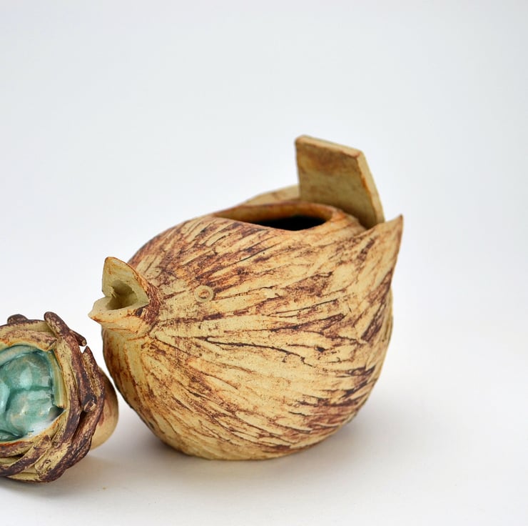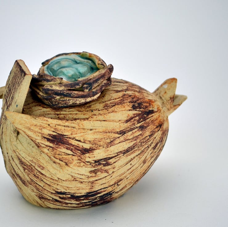 Made from two pinch pots and the wings, tail and beak modelled on later. Fired to stoneware. Inside is glazed a lovely pool blue and the outside is brushed with oxides to accentuate the carving.