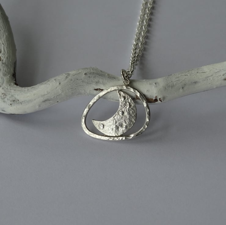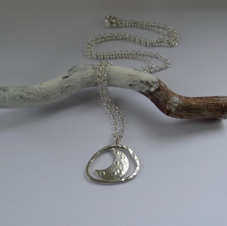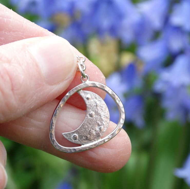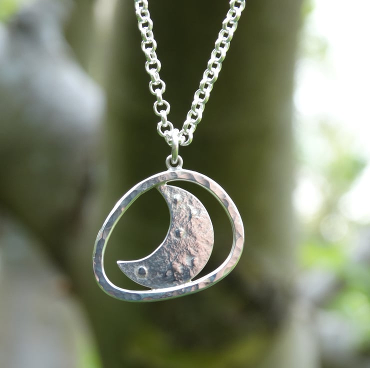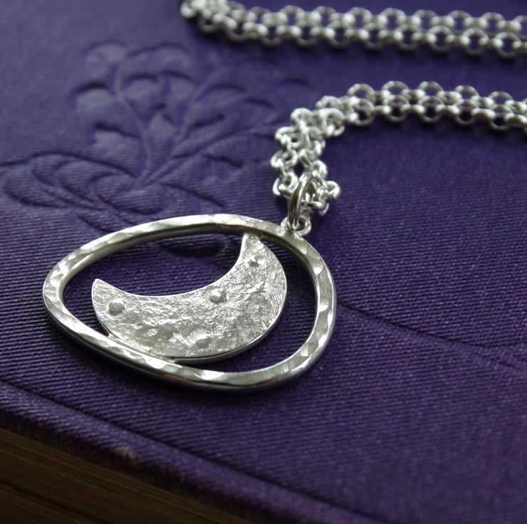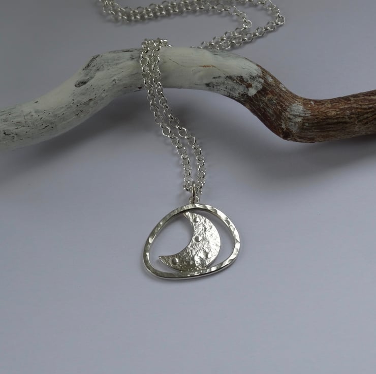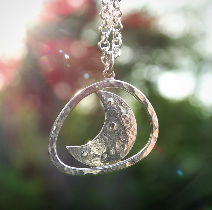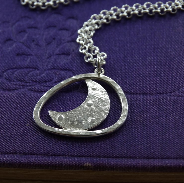 The moon has been hand cut using a jeweller's saw then given an embossed finish which has been created by hammering the silver on to a design which I have made from watercolour paper. This gives a lovely dimpled background texture.