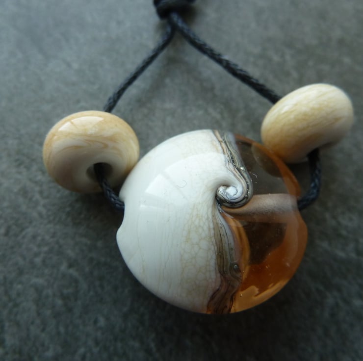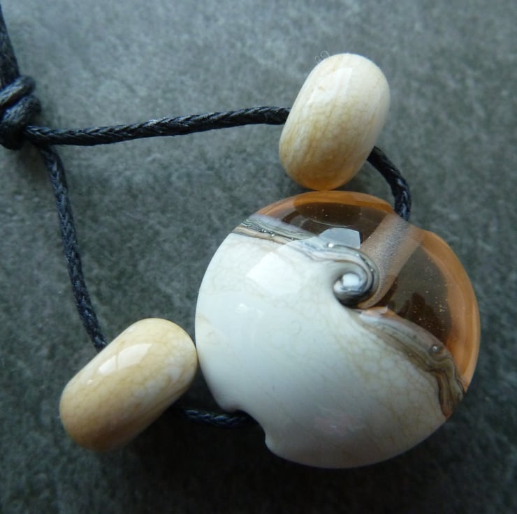 A lampwork glass bead made with ivory and transparent peach/ pink glass, it has been wrapped with silvered ivory and shaped into a lentil.