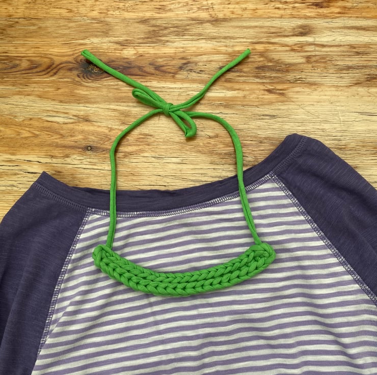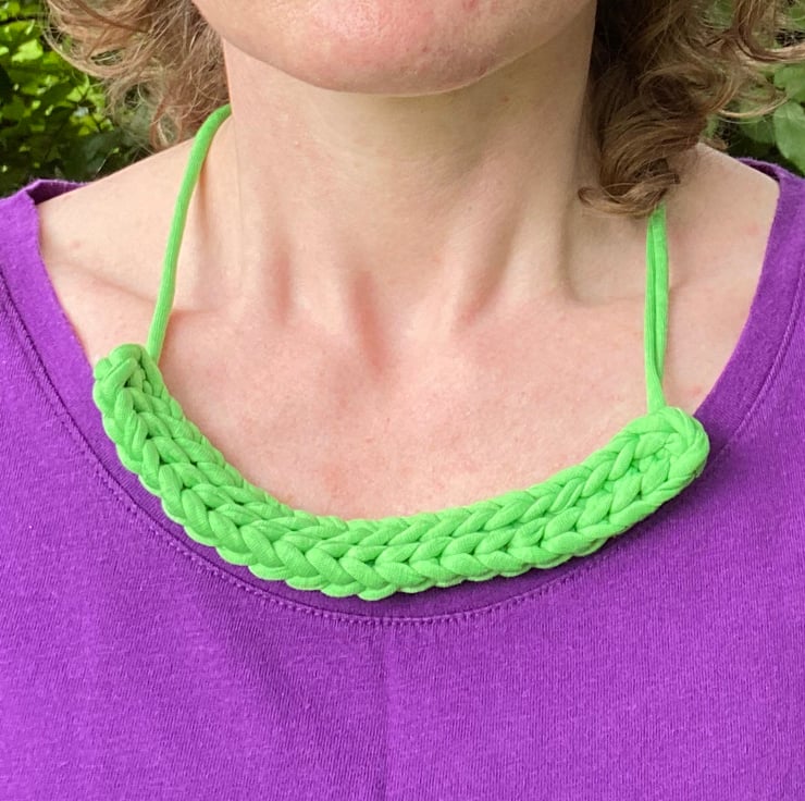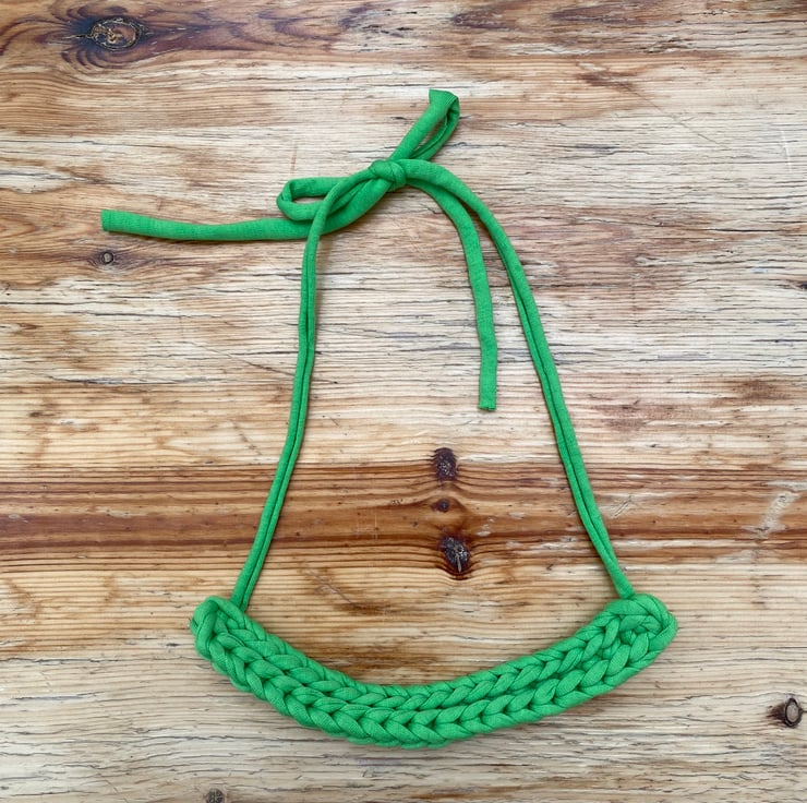 I’ve crocheted this necklace in bright green t-shirt cotton - which is a waste product from the fabric industry.