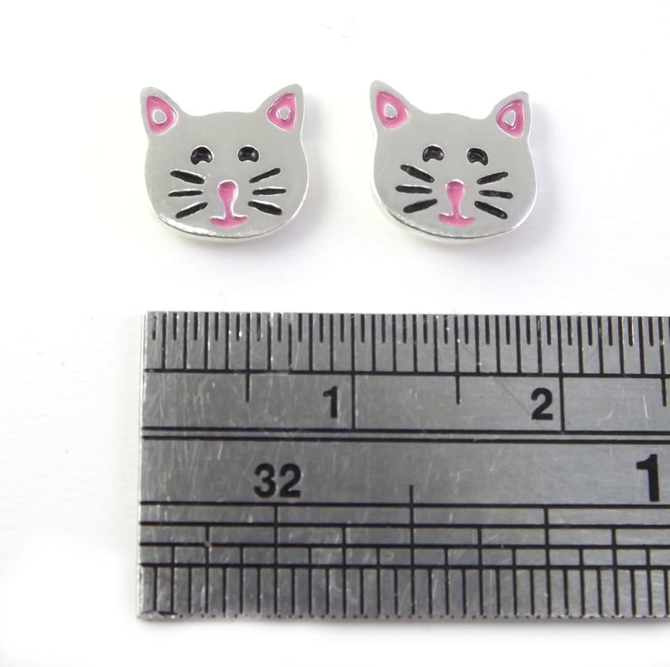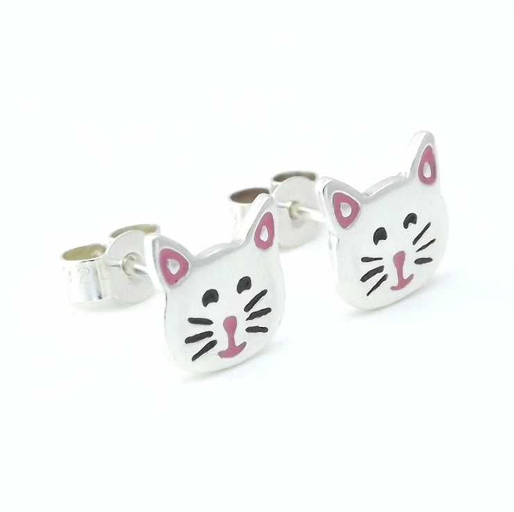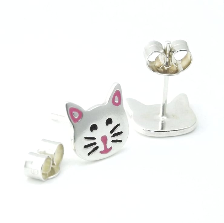 These cat stud earrings have been lovingly handcrafted in the UK. They are made from sterling silver sheet and are etched before being cut by hand, the edges are then smoothed using files and emery paper before the earrings are carefully given there shape using a punch and hammer. 11mm ear pins are then soldered onto the back. Pink and black resin based enamels are added to the etched areas and then the earrings are polished.