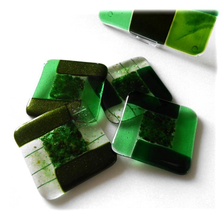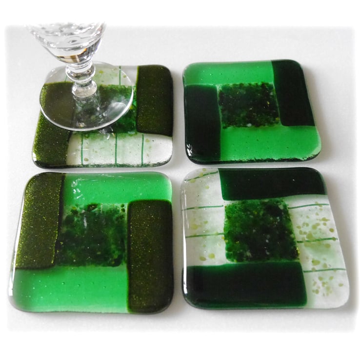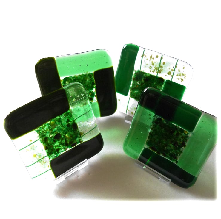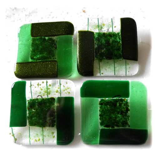I've used 4 different shades and types of green coloured glass for the borders,2 colours per coaster, so they are all individual but colour coordinated so they make a set.