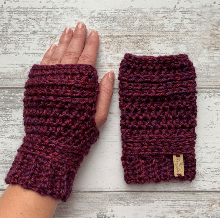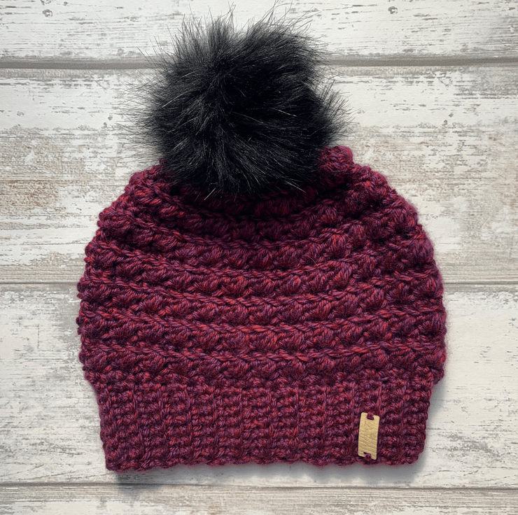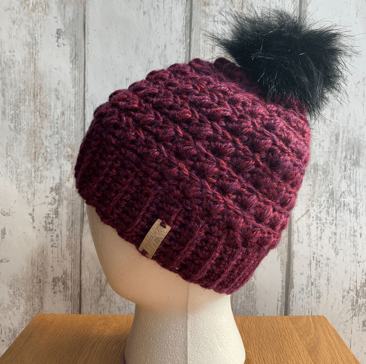 This beautiful handmade soft beanie hat and fingerless glove set has been made with chilly winter mornings in mind.I have used high quality soft acrylic aran yarn in “Isle Royale” to create this beautiful deep plum coloured set that also has hints of red running through the yarn. The black fur pompom is detachable so the hat can be washed.
