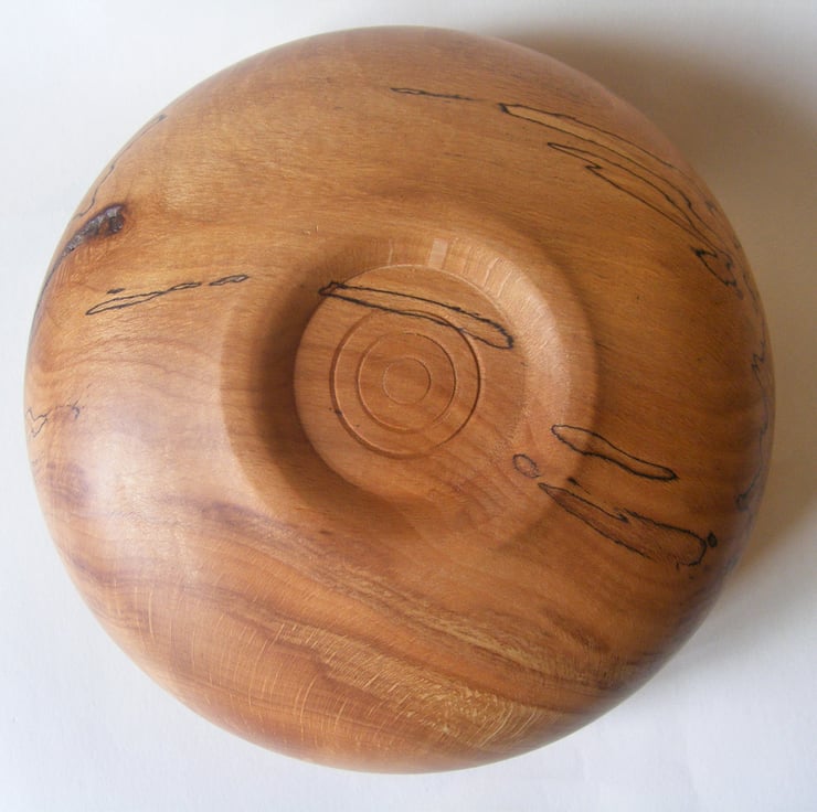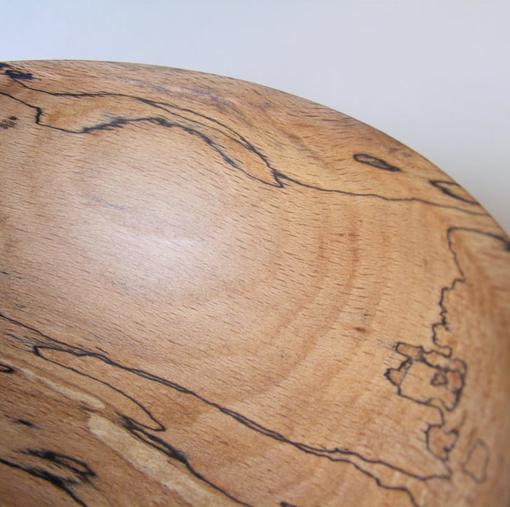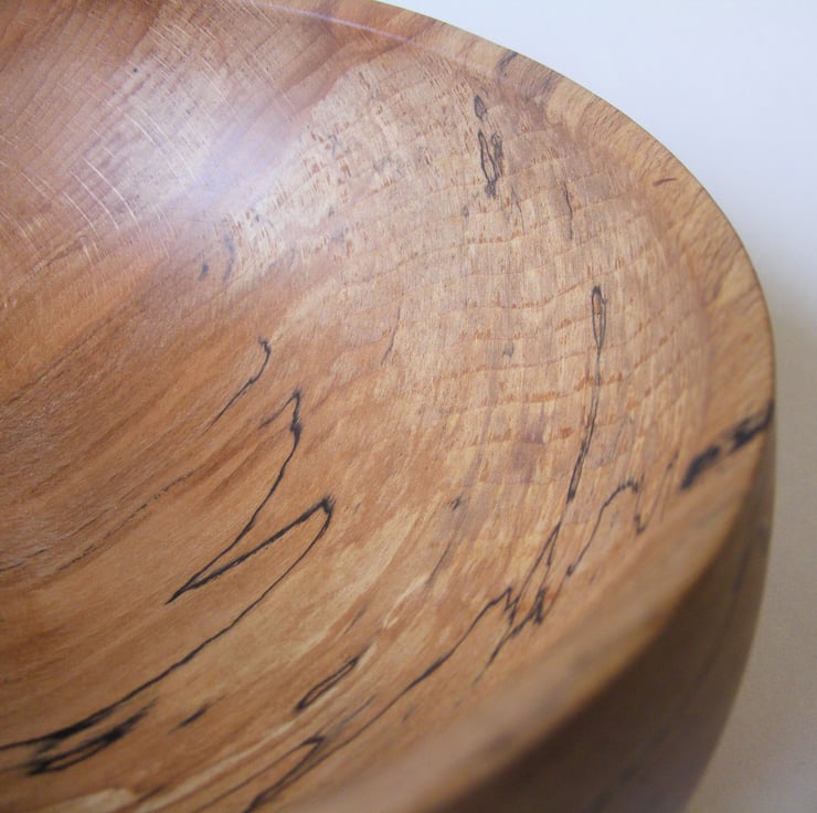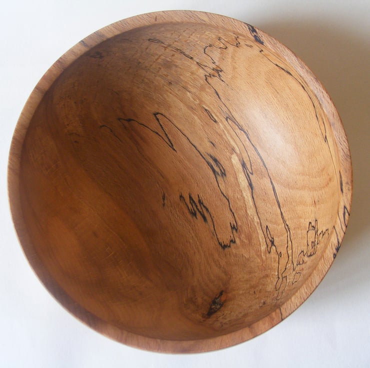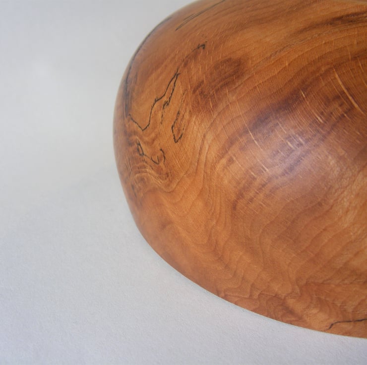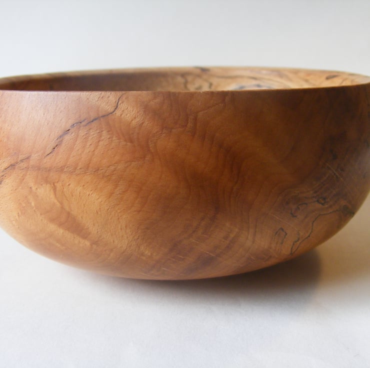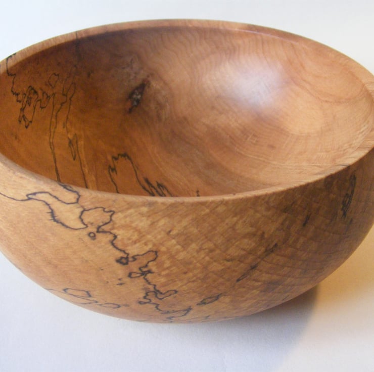 Spalted beech bowl, 156 x 64 mm high. Finished in Danish oil. A really nice spalted beech closed form bowl, it has some lovely spalting patterns and the grain is amazing with ripples and some really good warm colours. The shape is a nice delicate curve going in towards the top with a narrow sloping rim. It would make a lovely decoration for any home.