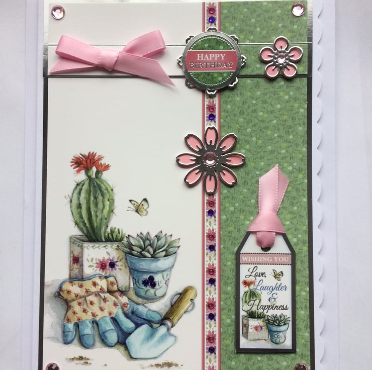 This is a lovely luxury 3D handmade greeting card to send to that special person in your life. The design is a gardening scene with cactus, floral gloves and a trowel. The 3D greetings are silver foiled and say "Happy Birthday" and "Wishing You Love, Laughter & Happiness". The 3D flowers have also been hand-cut and silver foiled by me.