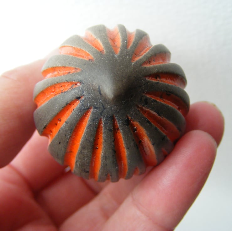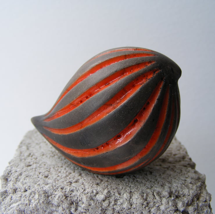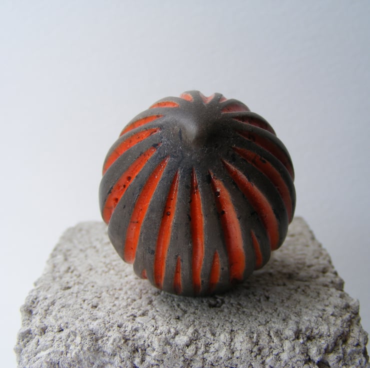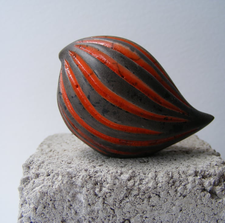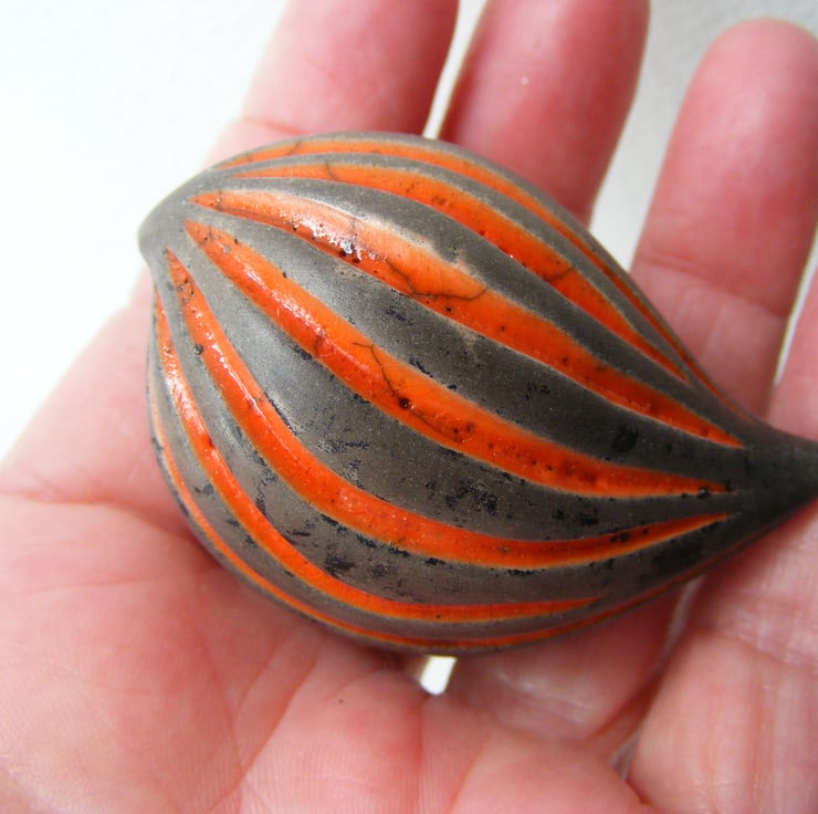 This bird is hand made and measures approx, 3.5cm high and 5.5cm long. It is made from white earthenware clay and carved before being fired in an electric kiln, it is then covered in orange raku glaze which when dry is wiped back leaving the glaze in the carved indents, it is then raku fired in a gas kiln, the black part of the bird has been sanded and is unglazed and polished with beeswax.