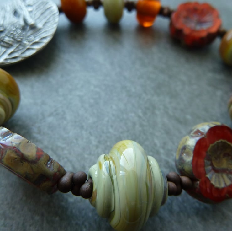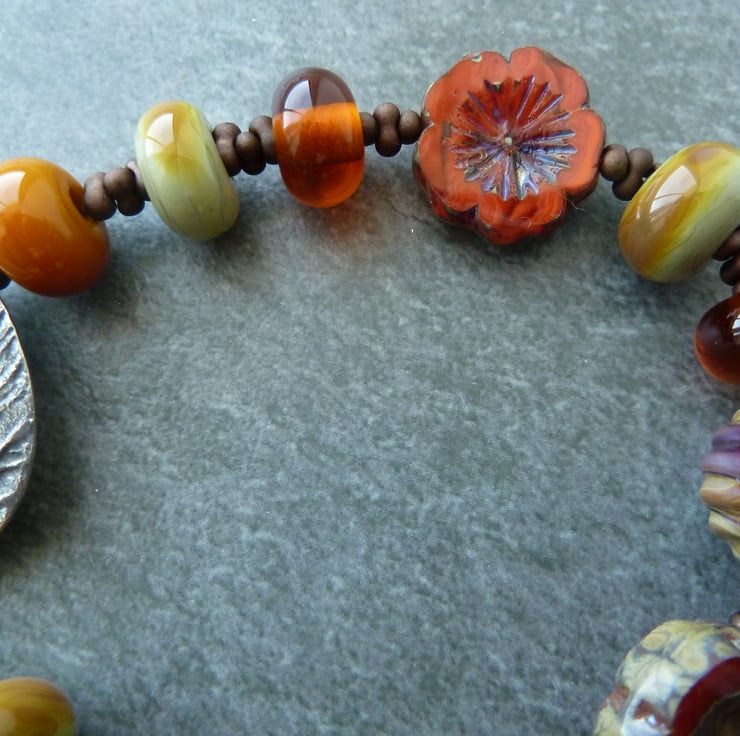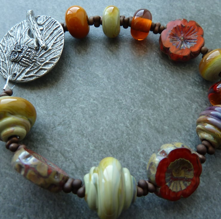 A bracelet made with various handmade lampwork glass beads with a Autumn tone. They have been strung with red flower glass beads.