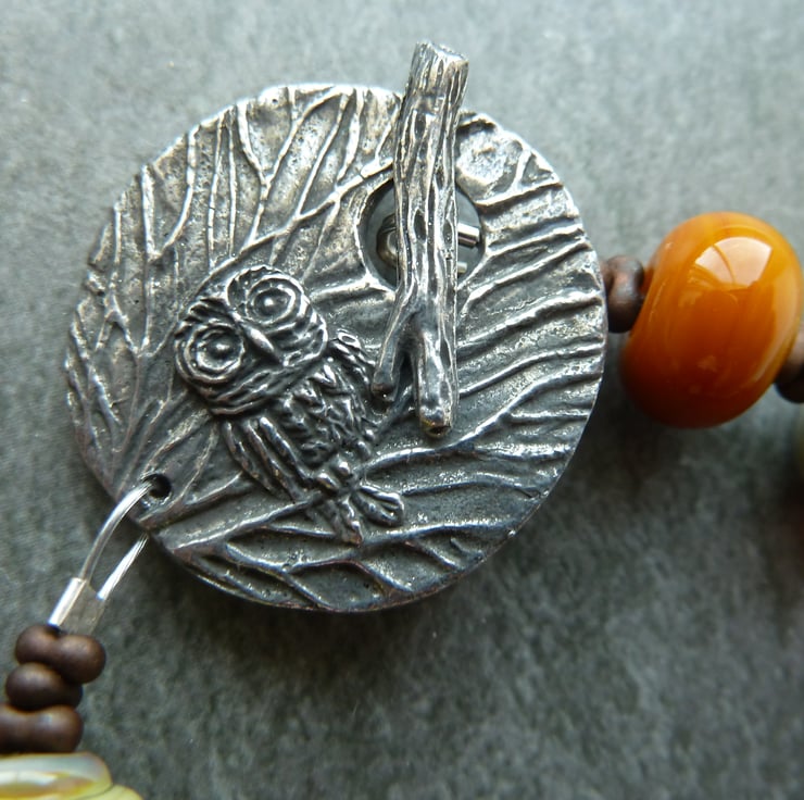 The bracelet fastens with a handmade pewter toggle which features a owl design.