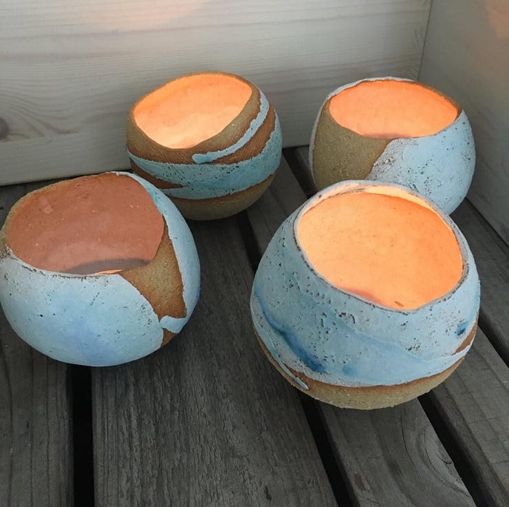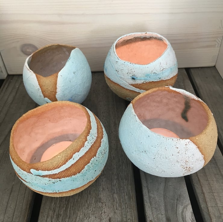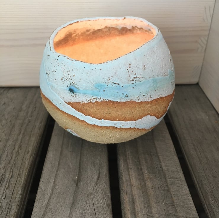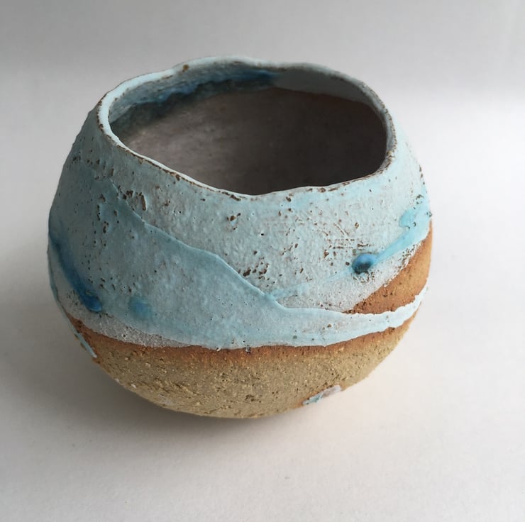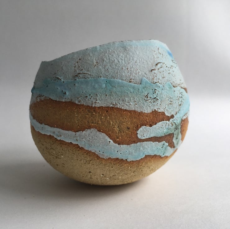 A ceramic pebble form made from a buff stoneware clay with overlapped turquoise glaze. Inside is a shiny glaze which reflects the light.