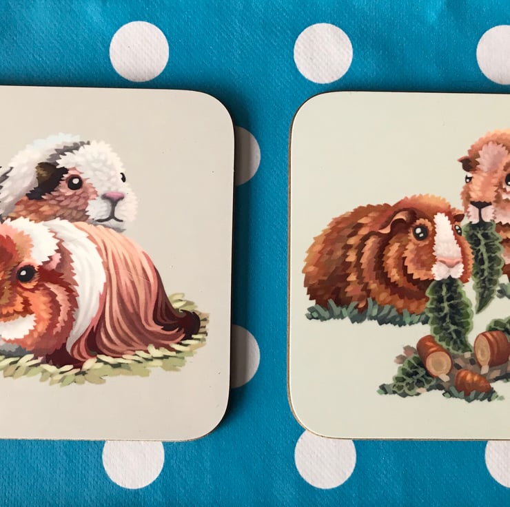 A pair of guinea pig coasters. 1 long haired guinea pigs and 1 ginger guinea pigs square coasters. Unisub Hardboard Coaster, 9cm square.
